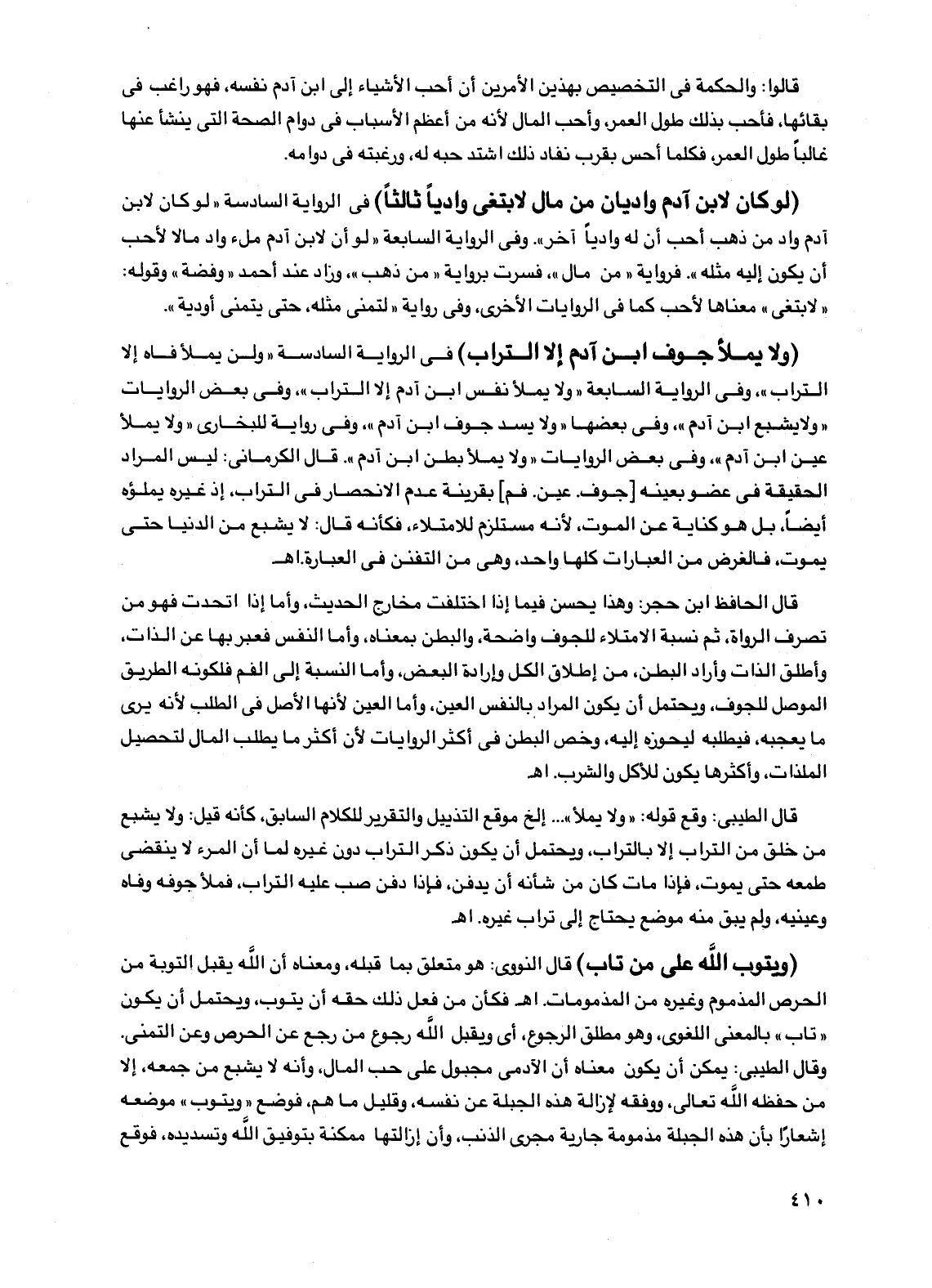 (لو كان لابن آدم واديان من مال لابتغى وادياً ثالثاً) في الرواية السادسة "لو كان لابن آدم واد من ذهب أحب أن له وادياً آخر". وفي الرواية السابعة "لو أن لابن آدم ملء واد مالاً لأحب أن يكون إليه مثله". فرواية "من مال"، فسرت برواية "من ذهب"، وزاد عند أحمد "وفضة" وقوله: "لابتغى" معناها لأحب كما في الروايات الأخرى، وفي رواية "لتمنى مثله، حتى يتمنى أودية".