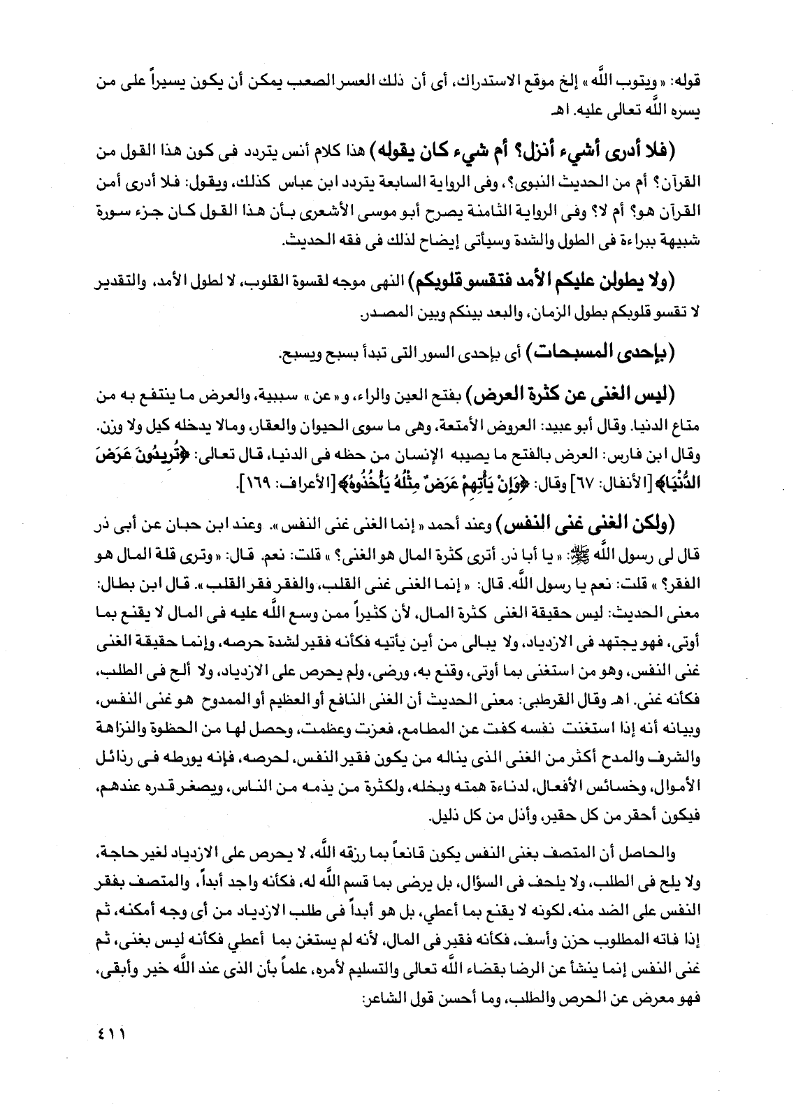 والحاصل أن المتصف بغنى النفس يكون قانعاً بما رزقه الله، لا يحرص على الازدياد لغير حاجة، ولا يلح في الطلب، ولا يلحف في السؤال، بل يرضى بما قسم الله له، فكأنه واجد أبداً، والمتصف بفقر النفس على الضد منه، لكونه لا يقنع بما أعطي، بل هو أبداً في طلب الازدياد من أي وجه أمكنه، ثم إذا فاته المطلوب حزن وأسف، فكأنه فقير في المال، لأنه لم يستغن بما أعطي فكأنه ليس بغني، ثم غنى النفس إنما ينشأ عن الرضا بقضاء الله تعالى والتسليم لأمره، علماً بأن الذي عند الله خير وأبقى، فهو معرض عن الحرص والطلب، وما أحسن قول الشاعر: