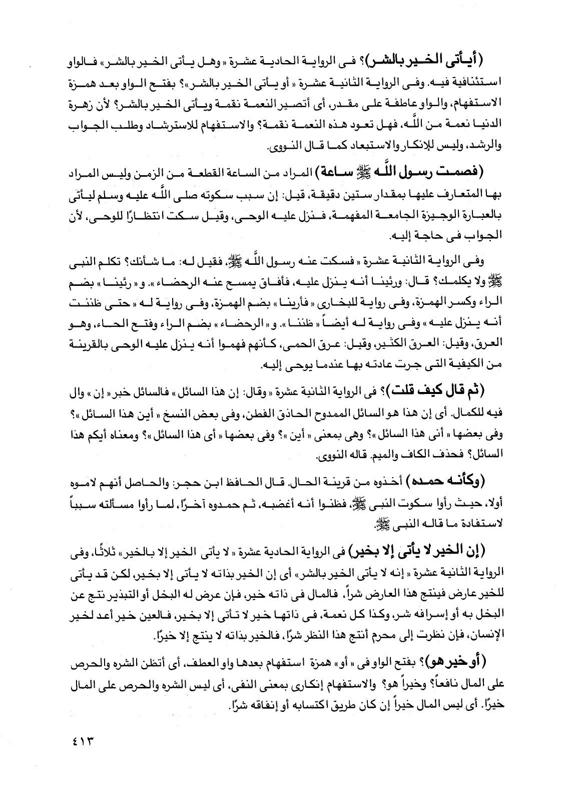 (أيأتي الخير بالشر)؟ في الرواية الحادية عشرة "وهل يأتي الخير بالشر" فالواو استئنافية فيه. وفي الرواية الثانية عشرة "أو يأتي الخير بالشر"؟ بفتح الواو بعد همزة الاستفهام، والواو عاطفة على مقدر، أي أتصير النعمة نقمة ويأتي الخير بالشر؟ لأن زهرة الدنيا نعمة من الله، فهل تعود هذه النعمة نقمة؟ والاستفهام للاسترشاد وطلب الجواب والرشد، وليس للإنكار والاستبعاد كما قال النووي.