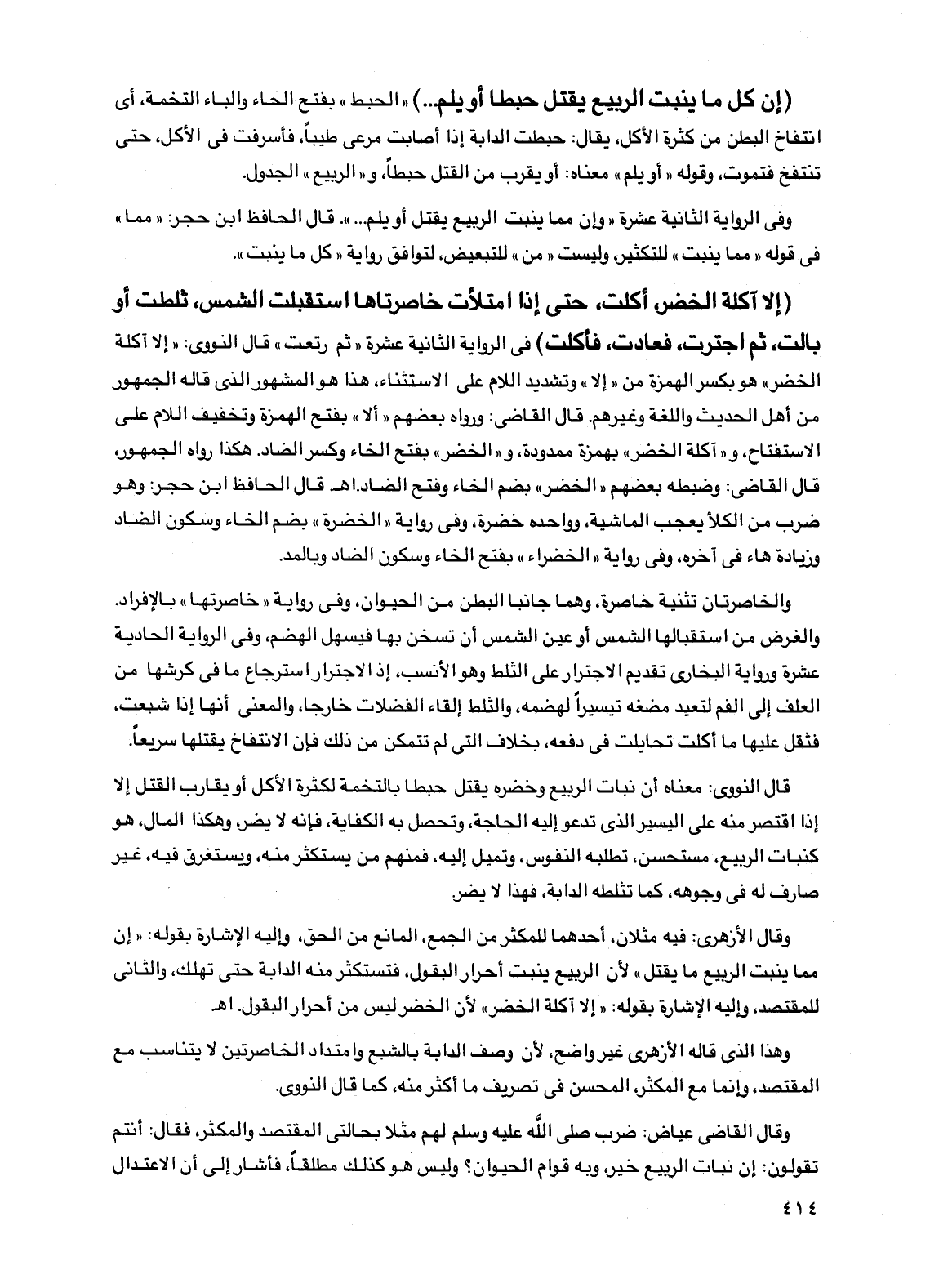 (إلا آكلة الخضر، أكلت، حتى إذا امتلأت خاصرتاها استقبلت الشمس، ثلطت أو بالت، ثم اجترت، فعادت، فأكلت) في الرواية الثانية عشرة "ثم رتعت" قال النووي: "إلا آكلة الخضر" هو بكسر الهمزة من "إلا" وتشديد اللام على الاستثناء، هذا هو المشهور الذي قاله الجمهور من أهل الحديث واللغة وغيرهم. قال القاضي: ورواه بعضهم "ألا" بفتح الهمزة وتخفيف اللام على الاستفتاح، و"آكلة الخضر" بهمزة ممدودة، و"الخضر" بفتح الخاء وكسر الضاد. هكذا رواه الجمهور، قال القاضي: وضبطه بعضهم "الخضر" بضم الخاء وفتح الضاد. اهـ قال الحافظ ابن حجر: وهو ضرب من الكلأ يعجب الماشية، وواحده خضرة، وفي رواية "الخضرة" بضم الخاء وسكون الضاد وزيادة هاء في آخره، وفي رواية "الخضراء" بفتح الخاء وسكون الضاد وبالمد.