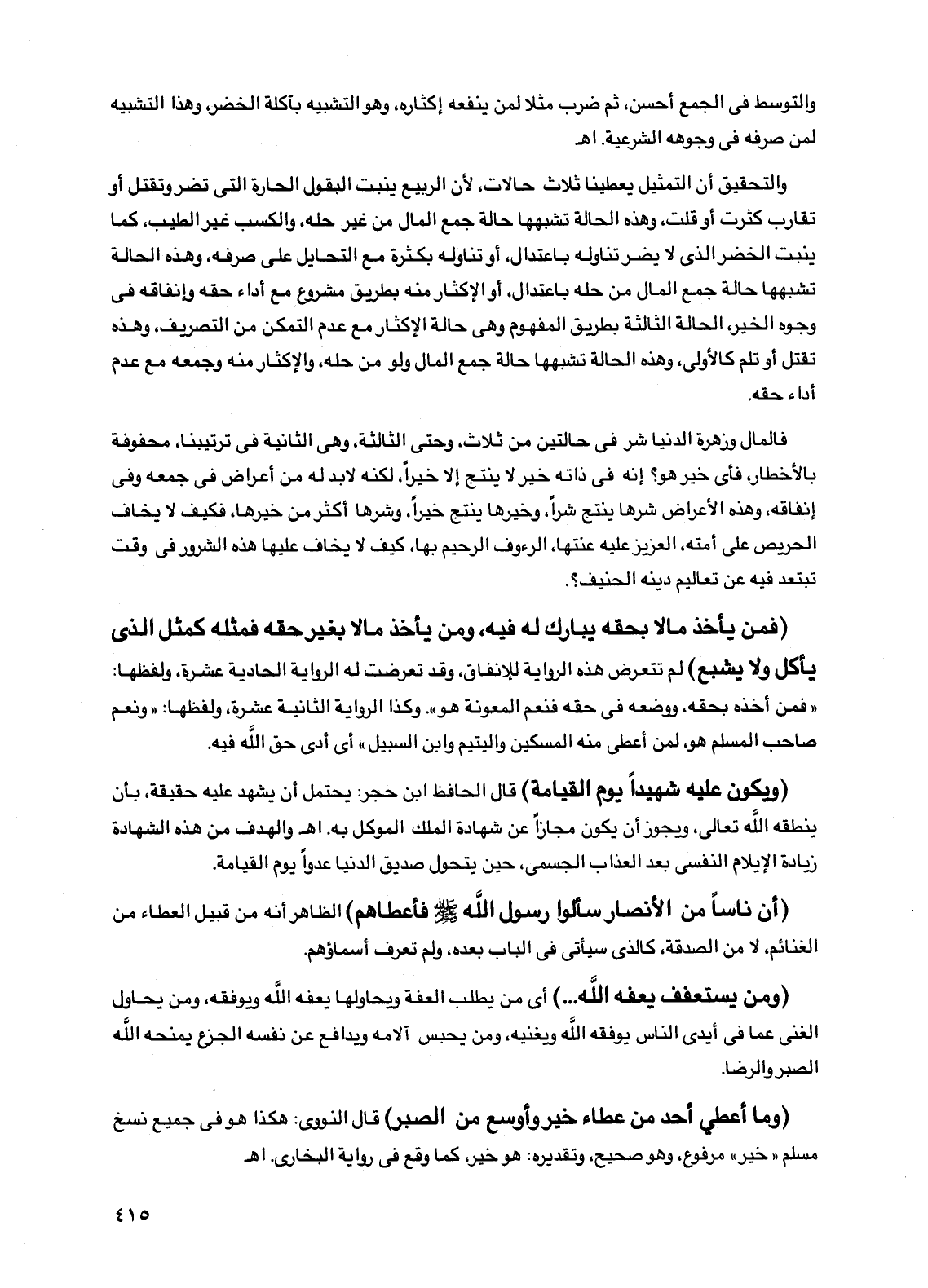 (فمن يأخذ مالاً بحقه يبارك له فيه، ومن يأخذ مالاً بغير حقه فمثله كمثل الذي يأكل ولا يشبع) لم تتعرض هذه الرواية للإنفاق، وقد تعرضت له الرواية الحادية عشرة، ولفظها: "فمن أخذه بحقه، ووضعه في حقه فنعم المعونة هو". وكذا الرواية الثانية عشرة، ولفظها: "ونعم صاحب المسلم هو، لمن أعطى منه المسكين واليتيم وابن السبيل" أي أدى حق الله فيه.