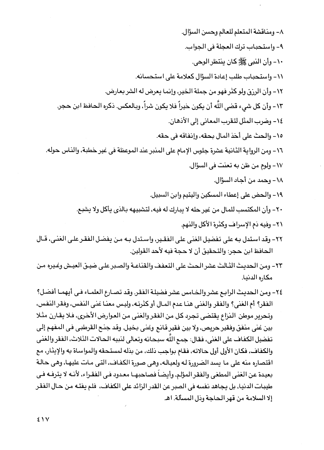 24 - ومن الحديث الرابع عشر والخامس عشر فضيلة الفقر. وقد تصارع العلماء في أيهما أفضل؟ الفقر؟ أم الغنى؟ والفقر والغنى هنا عدم المال أو كثرته، وليس معنا غنى النفس، وفقر النفس، وتحرير موطن النزاع يقتضي تجرد كل من الفقر والغنى من العوارض الأخرى، فلا يقارن مثلاً بين غنى منفق وفقير حريص، ولا بين فقير قانع وغني بخيل، وقد جنح القرطبي في المفهم إلى تفضيل الكفاف على الغنى، فقال: جمع الله سبحانه وتعالى لنبيه الحالات الثلاث، الفقر والغنى والكفاف، فكان الأول أول حالاته، فقام بواجب ذلك، من بذله لمستحقه والمواساة به والإيثار، مع اقتصاره منه على ما يسد الضرورة له ولعياله، وهي صورة الكفاف، التي مات عليها، وهي حالة بعيدة عن الغنى المطغي والفقر المؤلم، وأيضاً فصاحبها معدود في الفقراء، لأنه لا يترفه في طيبات الدنيا، بل يجاهد نفسه في الصبر عن القدر الزائد على الكفاف، فلم يفته من حال الفقر إلا السلامة من قهر الحاجة وذل المسألة. اهـ.