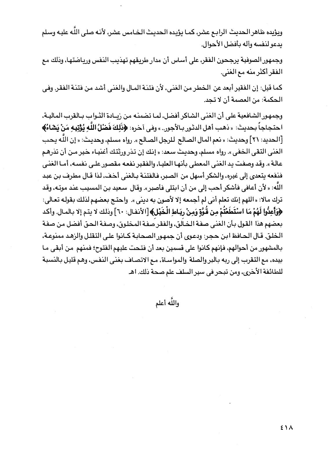 وجمهور الشافعية على أن الغني الشاكر أفضل، لما تضمنه من زيادة الثواب بالقرب المالية، احتجاجاً بحديث: "ذهب أهل الدثور بالأجور ... " وفي آخره: {ذلك فضل الله يؤتيه من يشاء} [الحديد: 21] وحديث: "نعم المال الصالح للرجل الصالح". رواه مسلم، وحديث: "إن الله يحب الغني التقي الخفي". رواه مسلم، وحديث سعد: "إنك إن تذر ورثتك أغنياء خير من أن تذرهم عالة". وقد وصفت يد الغني المعطي بأنها العليا، والفقير نفعه مقصور على نفسه، أما الغني فنفعه يتعدى إلى غيره، والشكر أسهل من الصبر، فالفتنة بالغنى أخف، لذا قال مطرف بن عبد الله: "لأن أعافى فأشكر أحب إلي من أن أبتلى فأصبر". وقال سعيد بن المسيب عند موته، وقد ترك مالاً: "اللهم إنك تعلم أني لم أجمعه إلا لأصون به ديني". واحتج بعضهم لذلك بقوله تعالى: {وأعدوا لهم ما استطعتم من قوة ومن رباط الخيل} [الأنفال: 60] وذلك لا يتم إلا بالمال. وأكد بعضهم هذا القول بأن الغنى صفة الخالق، والفقر صفة المخلوق، وصفة الحق أفضل من صفة الخلق. قال الحافظ ابن حجر: ودعوى أن جمهور الصحابة كانوا على التقلل والزهد ممنوعة، بالمشهور من أحوالهم، فإنهم كانوا على قسمين بعد أن فتحت عليهم الفتوح؛ فمنهم من أبقى ما بيده، مع التقرب إلى ربه بالبر والصلة والمواساة، مع الاتصاف بغنى النفس، وهم قليل بالنسبة للطائفة الأخرى، ومن تبحر في سير السلف علم صحة ذلك. اهـ.