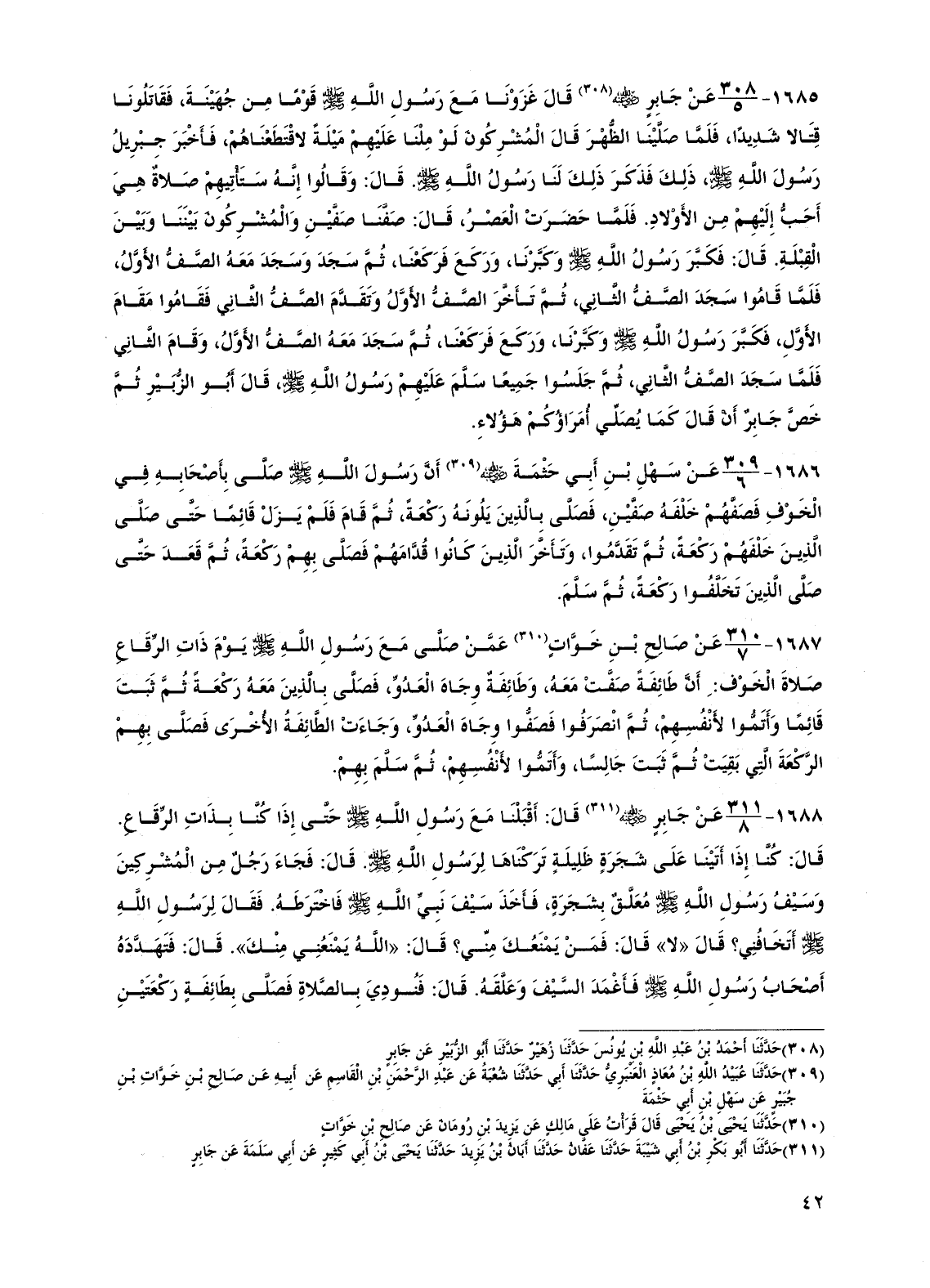 1685 - عن جابر رضي الله عنه قال غزونا مع رسول الله صلى الله عليه وسلم قوما من جهينة، فقاتلونا قتالاً شديداً، فلما صلينا الظهر قال المشركون لو ملنا عليهم ميلة لاقتطعناهم، فأخبر جبريل رسول الله صلى الله عليه وسلم، ذلك فذكر ذلك لنا رسول الله صلى الله عليه وسلم. قال: وقالوا إنه ستأتيهم صلاة هي أحب إليهم من الأولاد. فلما حضرت العصر، قال: صفنا صفين والمشركون بيننا وبين القبلة. قال: فكبر رسول الله صلى الله عليه وسلم وكبرنا، وركع فركعنا، ثم سجد وسجد معه الصف الأول، فلما قاموا سجد الصف الثاني، ثم تأخر الصف الأول وتقدم الصف الثاني فقاموا مقام الأول، فكبر رسول الله صلى الله عليه وسلم وكبرنا، وركع فركعنا، ثم سجد معه الصف الأول، وقام الثاني فلما سجد الصف الثاني، ثم جلسوا جميعاً سلم عليهم رسول الله صلى الله عليه وسلم، قال أبو الزبير ثم خص جابر أن قال كما يصلي أمراؤكم هؤلاء.
