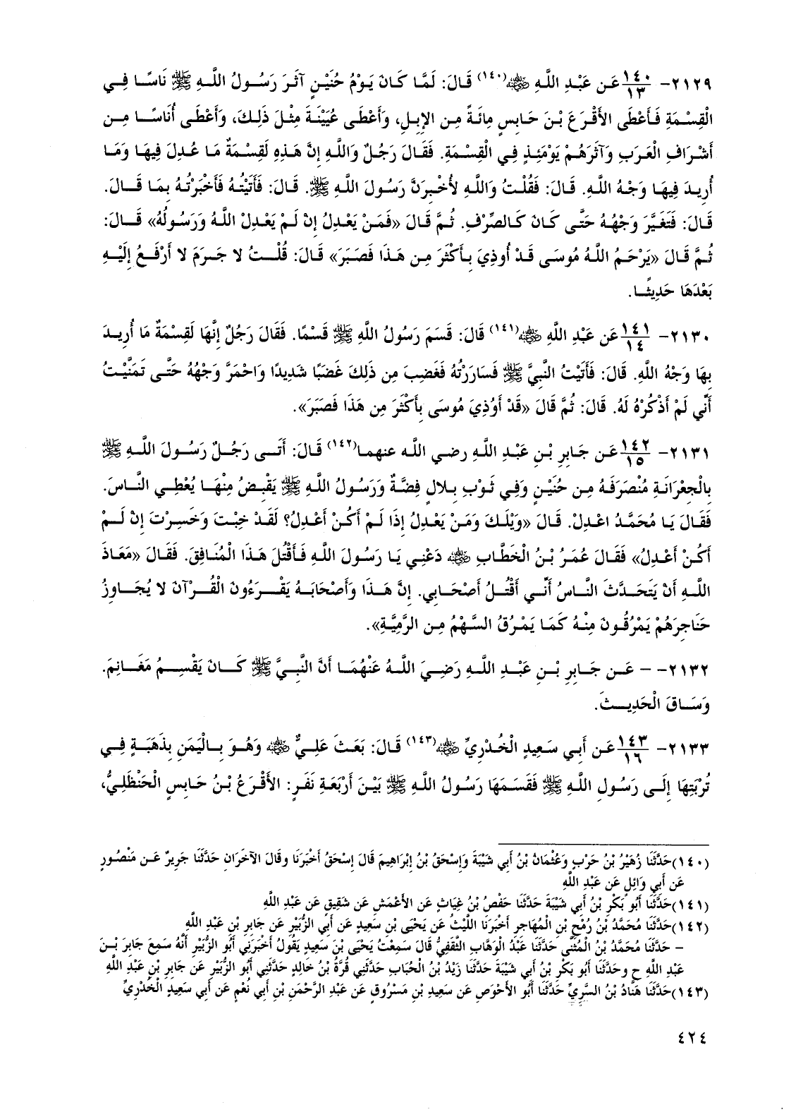 2129 - عن عبد الله رضي الله عنه قال: لما كان يوم حنين آثر رسول الله صلى الله عليه وسلم ناساً في القسمة فأعطى الأقرع بن حابس مائة من الإبل، وأعطى عيينة مثل ذلك، وأعطى أناساً من أشراف العرب وآثرهم يومئذ في القسمة. فقال رجل والله إن هذه لقسمة ما عدل فيها وما أريد فيها وجه الله. قال: فقلت والله لأخبرن رسول الله صلى الله عليه وسلم. قال: فأتيته فأخبرته بما قال. قال: فتغير وجهه حتى كان كالصرف. ثم قال "فمن يعدل إن لم يعدل الله ورسوله" قال: ثم قال "يرحم الله موسى قد أوذي بأكثر من هذا فصبر" قال: قلت لا جرم لا أرفع إليه بعدها حديثاً.
