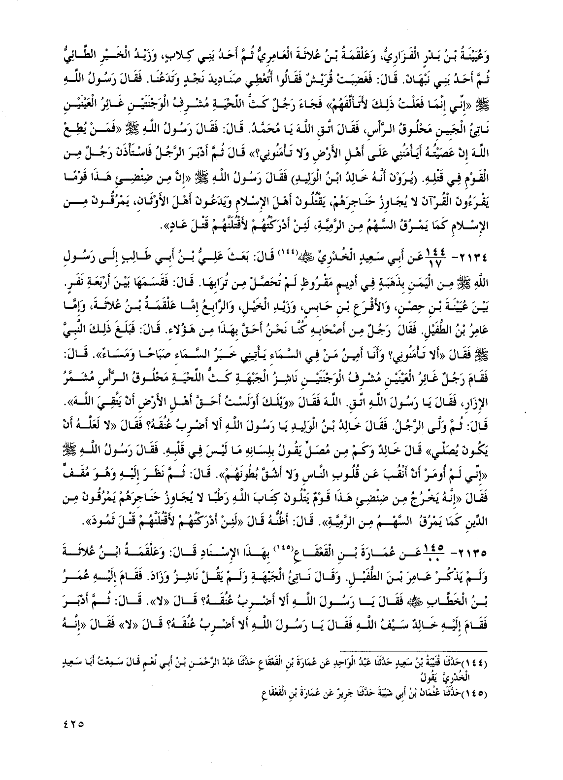 2134 - عن أبي سعيد الخدري رضي الله عنه قال: بعث علي بن أبي طالب إلى رسول الله صلى الله عليه وسلم من اليمن بذهبة في أديم مقروظ لم تحصل من ترابها. قال: فقسمها بين أربعة نفر. بين عيينة بن حصن، والأقرع بن حابس، وزيد الخيل، والرابع إما علقمة بن علاثة، وإما عامر بن الطفيل. فقال رجل من أصحابه كنا نحن أحق بهذا من هؤلاء. قال: فبلغ ذلك النبي صلى الله عليه وسلم فقال "ألا تأمنوني؟ وأنا أمين من في السماء يأتيني خبر السماء صباحاً ومساء". قال: فقام رجل غائر العينين مشرف الوجنتين ناشز الجبهة كث اللحية محلوق الرأس مشمر الإزار، فقال يا رسول الله اتق الله فقال "ويلك أولست أحق أهل الأرض أن يتقي الله". قال: ثم ولى الرجل. فقال خالد بن الوليد يا رسول الله ألا أضرب عنقه؟ فقال "لا لعله أن يكون يصلي" قال خالد وكم من مصل يقول بلسانه ما ليس في قلبه. فقال رسول الله صلى الله عليه وسلم "إني لم أومر أن أنقب عن قلوب الناس ولا أشق بطونهم". قال: ثم نظر إليه وهو مقف فقال "إنه يخرج من ضئضئ هذا قوم يتلون كتاب الله رطباً لا يجاوز حناجرهم يمرقون من الدين كما يمرق السهم من الرمية". قال: أظنه قال "لئن أدركتهم لأقتلنهم قتل ثمود".