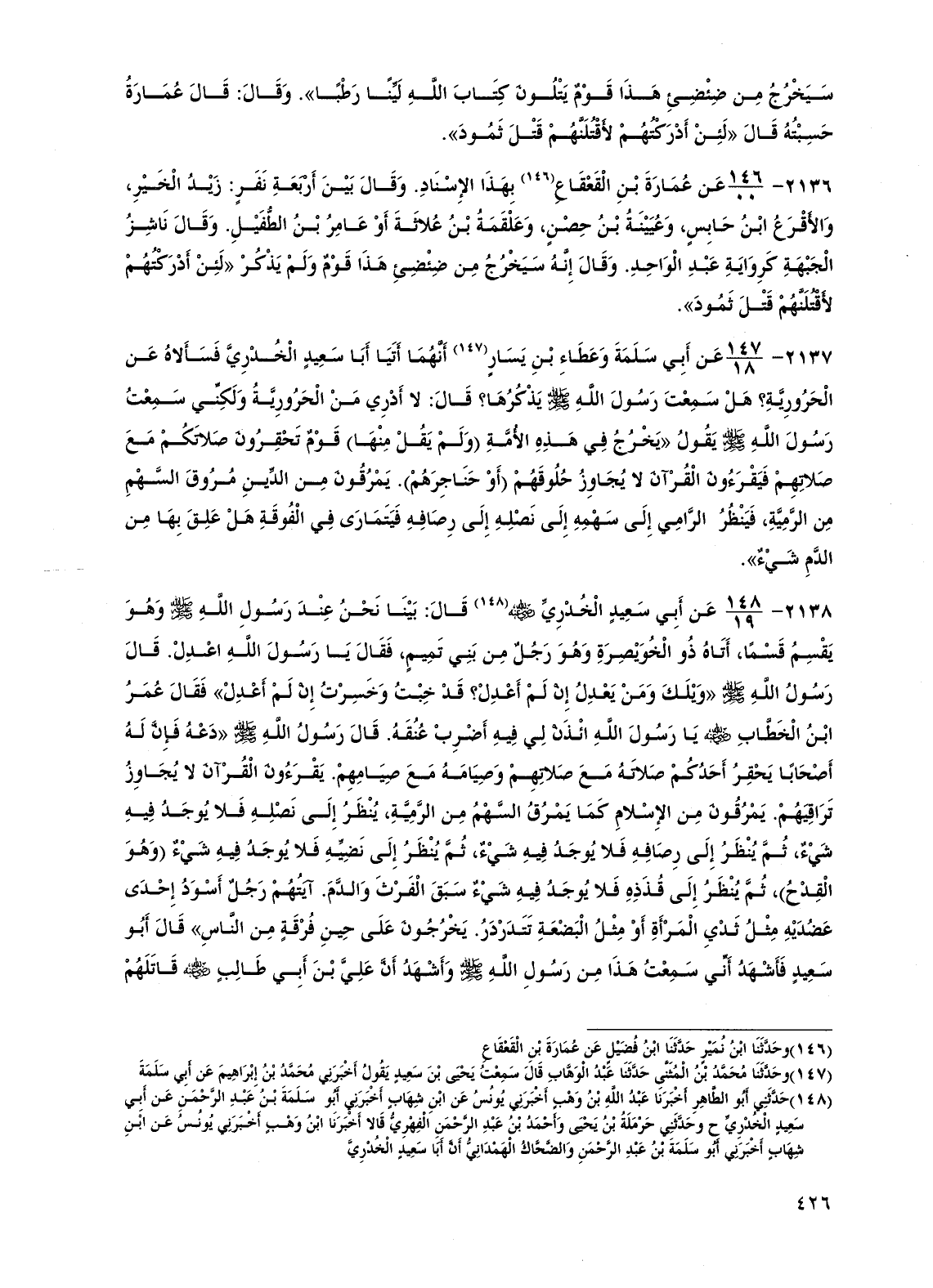 2138 - عن أبي سعيد الخدري رضي الله عنه قال: بينا نحن عند رسول الله صلى الله عليه وسلم وهو يقسم قسماً، أتاه ذو الخويصرة وهو رجل من بني تميم، فقال يا رسول الله اعدل. قال رسول الله صلى الله عليه وسلم "ويلك ومن يعدل إن لم أعدل؟ قد خبت وخسرت إن لم أعدل" فقال عمر بن الخطاب رضي الله عنه يا رسول الله ائذن لي فيه أضرب عنقه. قال رسول الله صلى الله عليه وسلم "دعه فإن له أصحاباً يحقر أحدكم صلاته مع صلاتهم وصيامه مع صيامهم. يقرءون القرآن لا يجاوز تراقيهم. يمرقون من الإسلام كما يمرق السهم من الرمية، ينظر إلى نصله فلا يوجد فيه شيء، ثم ينظر إلى رصافه فلا يوجد فيه شيء، ثم ينظر إلى نضيه فلا يوجد فيه شيء (وهو القدح)، ثم ينظر إلى قذذه فلا يوجد فيه شيء سبق الفرث والدم. آيتهم رجل أسود إحدى عضديه مثل ثدي المرأة أو مثل البضعة تتدردر. يخرجون على حين فرقة من الناس" قال أبو سعيد فأشهد أني سمعت هذا من رسول الله صلى الله عليه وسلم وأشهد أن علي بن أبي طالب رضي الله عنه قاتلهم
