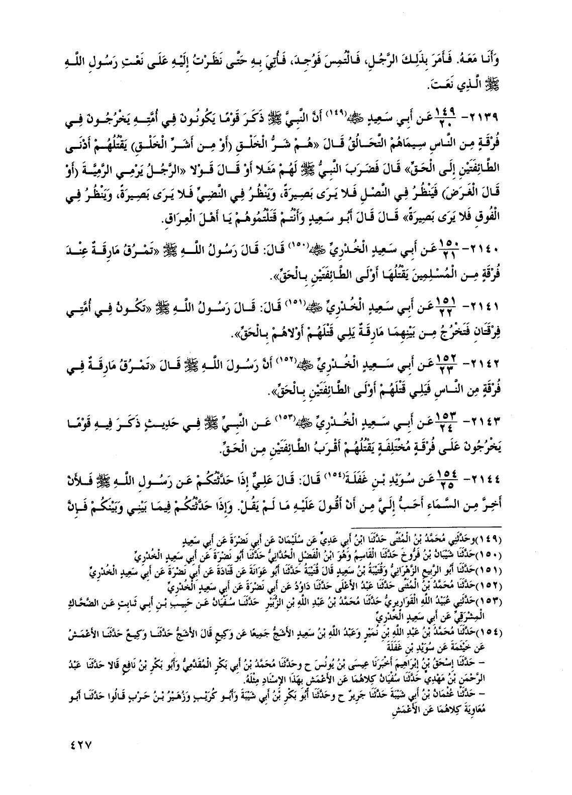 2142 - عن أبي سعيد الخدري رضي الله عنه أن رسول الله صلى الله عليه وسلم قال "تمرق مارقة في فرقة من الناس فيلي قتلهم أولى الطائفتين بالحق".