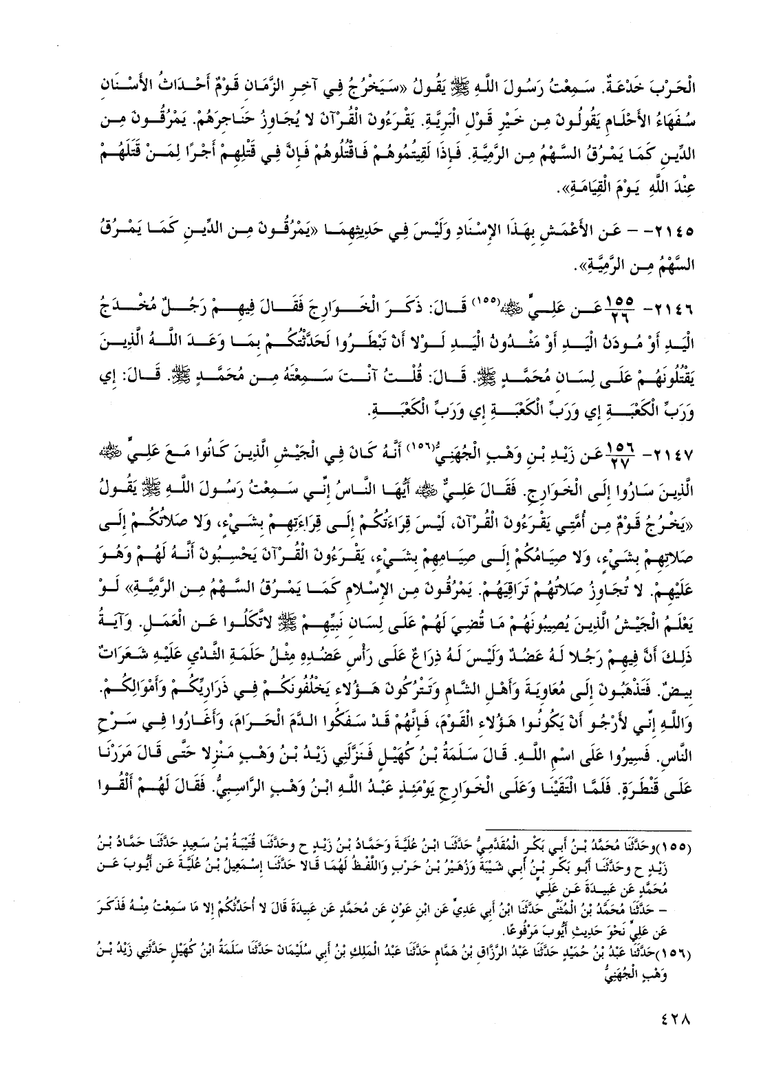 2147 - عن زيد بن وهب الجهني أنه كان في الجيش الذين كانوا مع علي رضي الله عنه الذين ساروا إلى الخوارج. فقال علي رضي الله عنه أيها الناس إني سمعت رسول الله صلى الله عليه وسلم يقول "يخرج قوم من أمتي يقرءون القرآن، ليس قراءتكم إلى قراءتهم بشيء، ولا صلاتكم إلى صلاتهم بشيء، ولا صيامكم إلى صيامهم بشيء، يقرءون القرآن يحسبون أنه لهم وهو عليهم. لا تجاوز صلاتهم تراقيهم. يمرقون من الإسلام كما يمرق السهم من الرمية" لو يعلم الجيش الذين يصيبونهم ما قضي لهم على لسان نبيهم صلى الله عليه وسلم لاتكلوا عن العمل. وآية ذلك أن فيهم رجلاً له عضد وليس له ذراع على رأس عضده مثل حلمة الثدي عليه شعرات بيض. فتذهبون إلى معاوية وأهل الشام وتتركون هؤلاء يخلفونكم في ذراريكم وأموالكم. والله إني لأرجو أن يكونوا هؤلاء القوم، فإنهم قد سفكوا الدم الحرام، وأغاروا في سرح الناس. فسيروا على اسم الله. قال سلمة بن كهيل فنزلني زيد بن وهب منزلاً حتى قال مررنا على قنطرة. فلما التقينا وعلى الخوارج يومئذ عبد الله بن وهب الراسبي. فقال لهم ألقوا