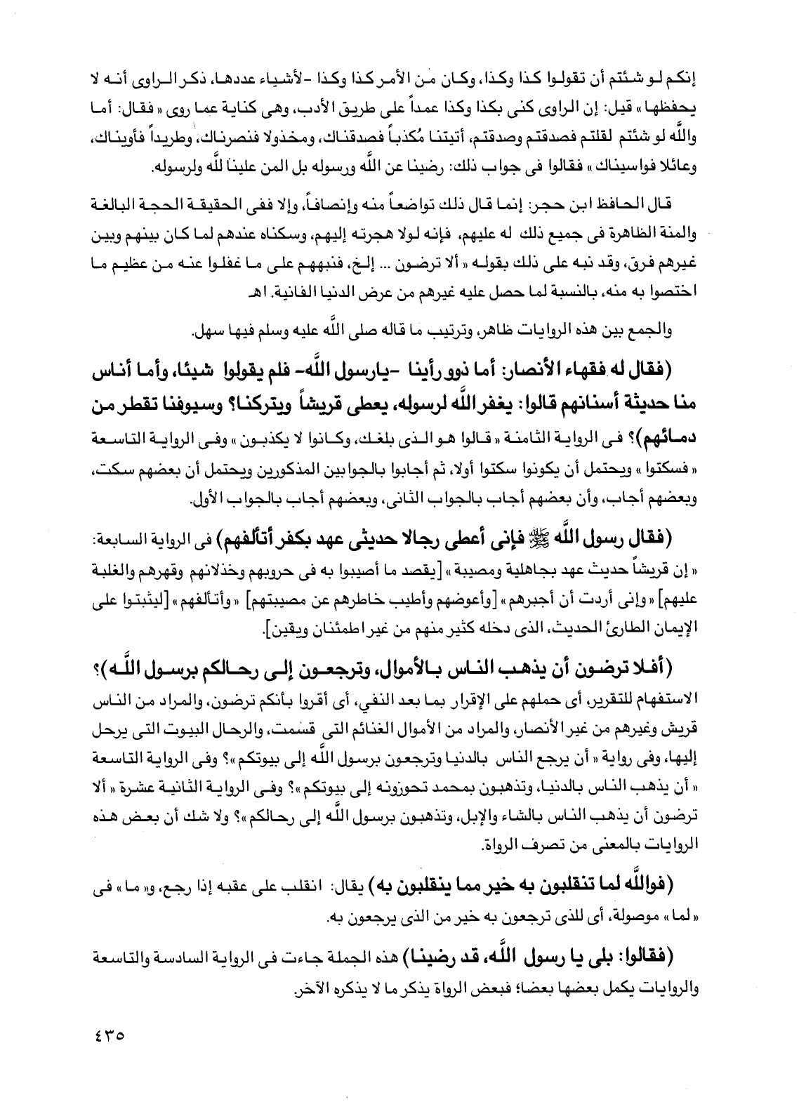 (أفلا ترضون أن يذهب الناس بالأموال، وترجعون إلى رحالكم برسول الله)؟ الاستفهام للتقرير، أي حملهم على الإقرار بما بعد النفي، أي أقروا بأنكم ترضون، والمراد من الناس قريش وغيرهم من غير الأنصار، والمراد من الأموال الغنائم التي قسمت، والرحال البيوت التي يرحل إليها، وفي رواية "أن يرجع الناس بالدنيا وترجعون برسول الله إلى بيوتكم"؟ وفي الرواية التاسعة "أن يذهب الناس بالدنيا، وتذهبون بمحمد تحوزونه إلى بيوتكم"؟ وفي الرواية الثانية عشرة "ألا ترضون أن يذهب الناس بالشاء والإبل، وتذهبون برسول الله إلى رحالكم"؟ ولا شك أن بعض هذه الروايات بالمعنى من تصرف الرواة.
