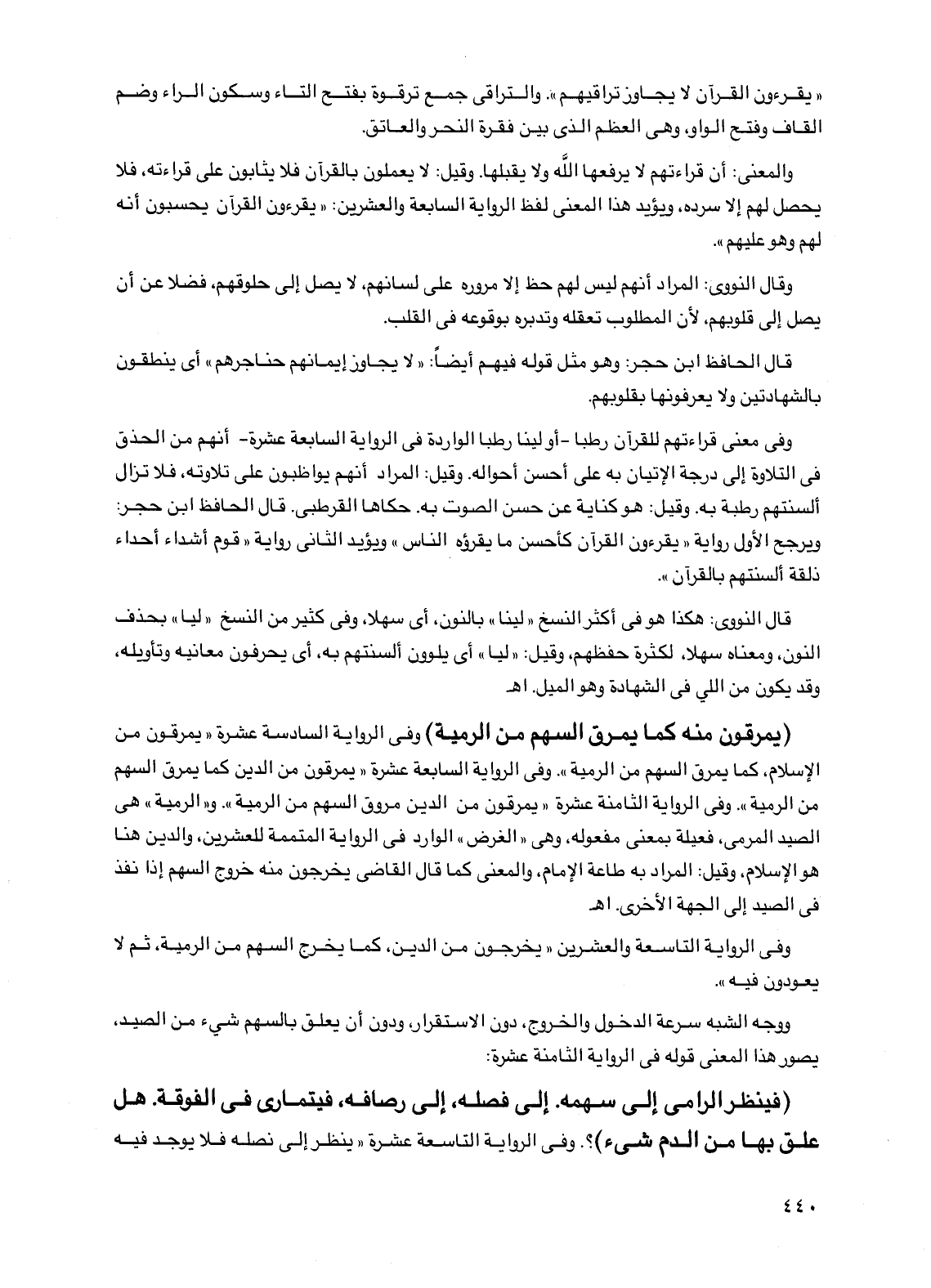 (يمرقون منه كما يمرق السهم من الرمية) وفي الرواية السادسة عشرة "يمرقون من الإسلام، كما يمرق السهم من الرمية". وفي الرواية السابعة عشرة "يمرقون من الدين كما يمرق السهم من الرمية". وفي الرواية الثامنة عشرة "يمرقون من الدين مروق السهم من الرمية". و"الرمية" هي الصيد المرمي، فعيلة بمعنى مفعوله، وهي "الغرض" الوارد في الرواية المتممة للعشرين، والدين هنا هو الإسلام، وقيل: المراد به طاعة الإمام، والمعنى كما قال القاضي يخرجون منه خروج السهم إذا نفذ في الصيد إلى الجهة الأخرى. اهـ.
