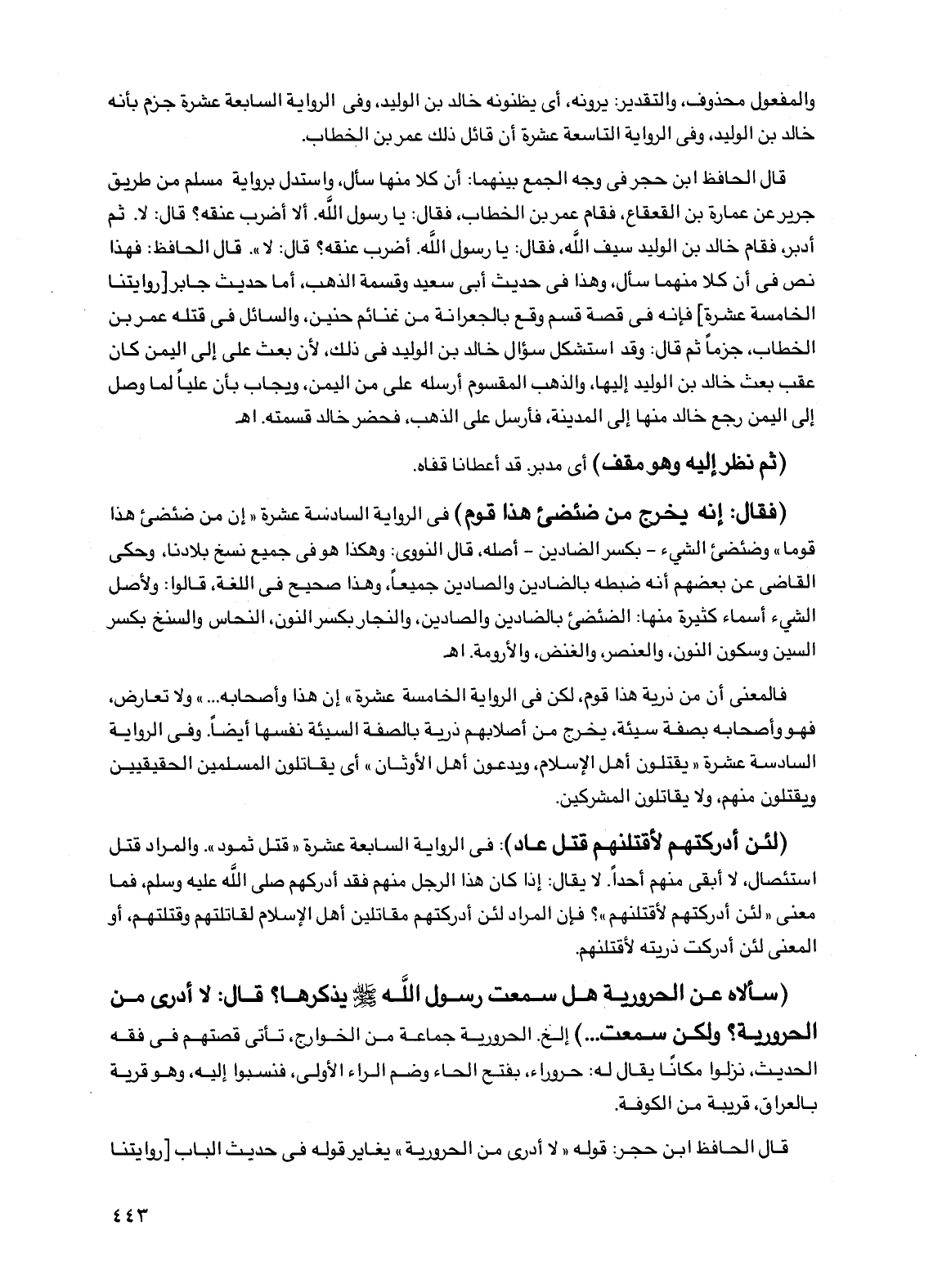 قال الحافظ ابن حجر في وجه الجمع بينهما: أن كلاً منها سأل، واستدل برواية مسلم من طريق جرير عن عمارة بن القعقاع، فقام عمر بن الخطاب، فقال: يا رسول الله. ألا أضرب عنقه؟ قال: لا. ثم أدبر، فقام خالد بن الوليد سيف الله، فقال: يا رسول الله. أضرب عنقه؟ قال: لا". قال الحافظ: فهذا نص في أن كلاً منهما سأل، وهذا في حديث أبي سعيد وقسمة الذهب، أما حديث جابر [روايتنا الخامسة عشرة] فإنه في قصة قسم وقع بالجعرانة من غنائم حنين، والسائل في قتله عمر بن الخطاب، جزماً ثم قال: وقد استشكل سؤال خالد بن الوليد في ذلك، لأن بعث علي إلى اليمن كان عقب بعث خالد بن الوليد إليها، والذهب المقسوم أرسله علي من اليمن، ويجاب بأن علياً لما وصل إلى اليمن رجع خالد منها إلى المدينة، فأرسل على الذهب، فحضر خالد قسمته. اهـ.