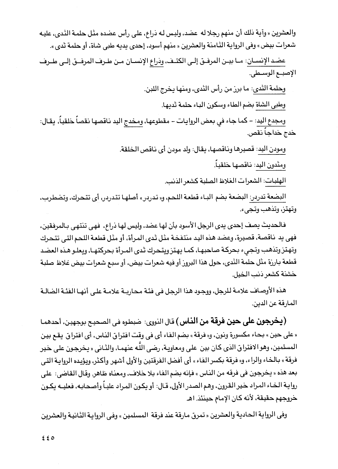 والعشرين "وآية ذلك أن منهم رجلاً له عضد، وليس له ذراع، على رأس عضده مثل حلمة الثدي، عليه شعرات بيض" وفي الرواية الثامنة والعشرين "منهم أسود، إحدى يديه طبي شاة، أو حلمة ثدي".