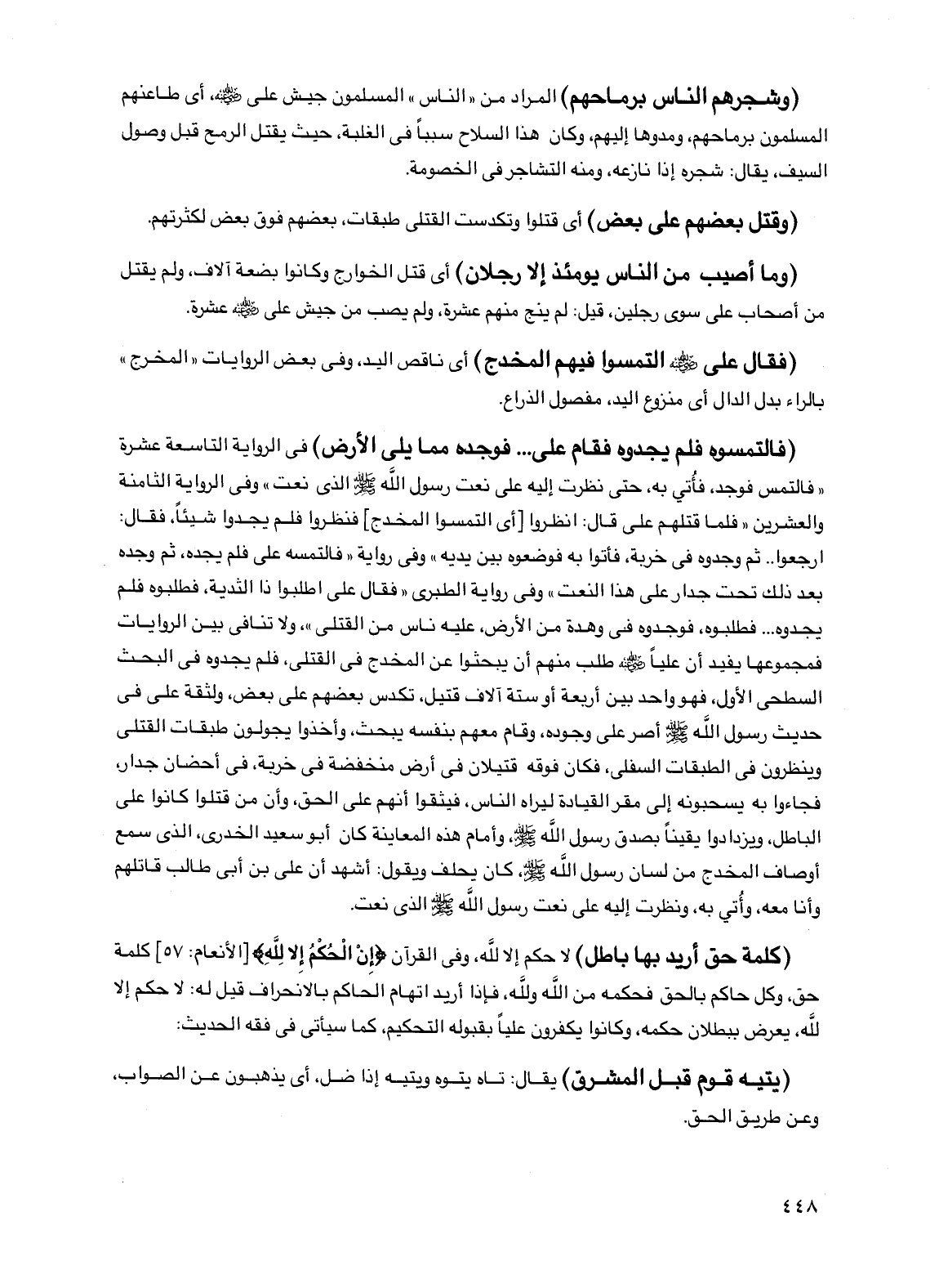 (فالتمسوه فلم يجدوه فقام علي .... فوجده مما يلي الأرض) في الرواية التاسعة عشرة "فالتمس فوجد، فأتي به، حتى نظرت إليه على نعت رسول الله صلى الله عليه وسلم الذي نعت" وفي الرواية الثامنة والعشرين "فلما قتلهم علي قال: انظروا [أي التمسوا المخدج] فنظروا فلم يجدوا شيئاً، فقال: ارجعوا .. ثم وجدوه في خربة، فأتوا به فوضعوه بين يديه" وفي رواية "فالتمسه علي فلم يجده، ثم وجده بعد ذلك تحت جدار علي هذا النعت" وفي رواية الطبري "فقال علي اطلبوا ذا الثدية، فطلبوه فلم يجدوه .... فطلبوه، فوجدوه في وهدة من الأرض، عليه ناس من القتلى"، ولا تنافي بين الروايات فمجموعها يفيد أن علياً رضي الله عنه طلب منهم أن يبحثوا عن المخدج في القتلى، فلم يجدوه في البحث السطحي الأول، فهو واحد بين أربعة أو ستة آلاف قتيل، تكدس بعضهم على بعض، ولثقة علي في حديث رسول الله صلى الله عليه وسلم أصر على وجوده، وقام معهم بنفسه يبحث، وأخذوا يجولون طبقات القتلى وينظرون في الطبقات السفلى، فكان فوقه قتيلان في أرض منخفضة في خربة، في أحضان جدار، فجاءوا به يسحبونه إلى مقر القيادة ليراه الناس، فيثقوا أنهم على الحق، وأن من قتلوا كانوا على الباطل، ويزدادوا يقيناً بصدق رسول الله صلى الله عليه وسلم، وأمام هذه المعاينة كان أبو سعيد الخدري، الذي سمع أوصاف المخدج من لسان رسول الله صلى الله عليه وسلم، كان يحلف ويقول: أشهد أن علي بن أبي طالب قاتلهم وأنا معه، وأتي به، ونظرت إليه على نعت رسول الله صلى الله عليه وسلم الذي نعت.