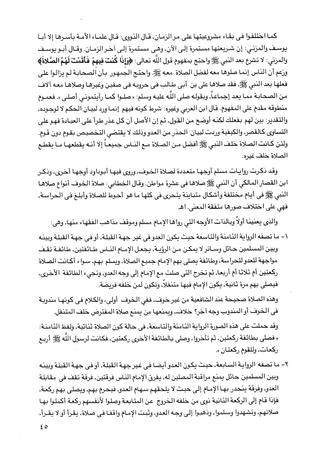 1 - ما تصفه الرواية الثامنة والتاسعة حيث يكون العدو في غير جهة القبلة، أو في جهة القبلة وبينه وبين المسلمين حائل وساتر لا يمكن من الرؤية، يجعل الإمام الناس طائفتين، طائفة تقف مواجهة للعدو للحراسة، وطائفة يصلي بهم الإمام جميع الصلاة، ويسلم بهم، سواء أكانت الصلاة ركعتين أم ثلاثاً أم أربعاً، ثم تخرج التي صلت مع الإمام إلى وجه العدو، وتجيء الطائفة الأخرى، فيصلي بهم مرة ثانية، يكون الإمام فيها متنفلاً، وتكون لمن خلفه فريضة.