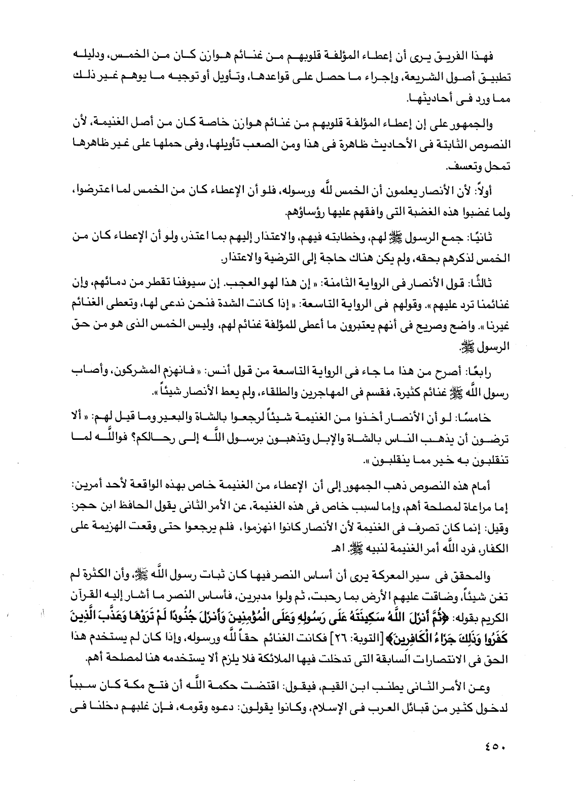 ثالثاً: قول الأنصار في الرواية الثامنة: "إن هذا لهو العجب. إن سيوفنا تقطر من دمائهم، وإن غنائمنا ترد عليهم". وقولهم في الرواية التاسعة: "إذا كانت الشدة فنحن ندعى لها، وتعطي الغنائم غيرنا". واضح وصريح في أنهم يعتبرون ما أعطى للمؤلفة غنائم لهم، وليس الخمس الذي هو من حق الرسول صلى الله عليه وسلم.