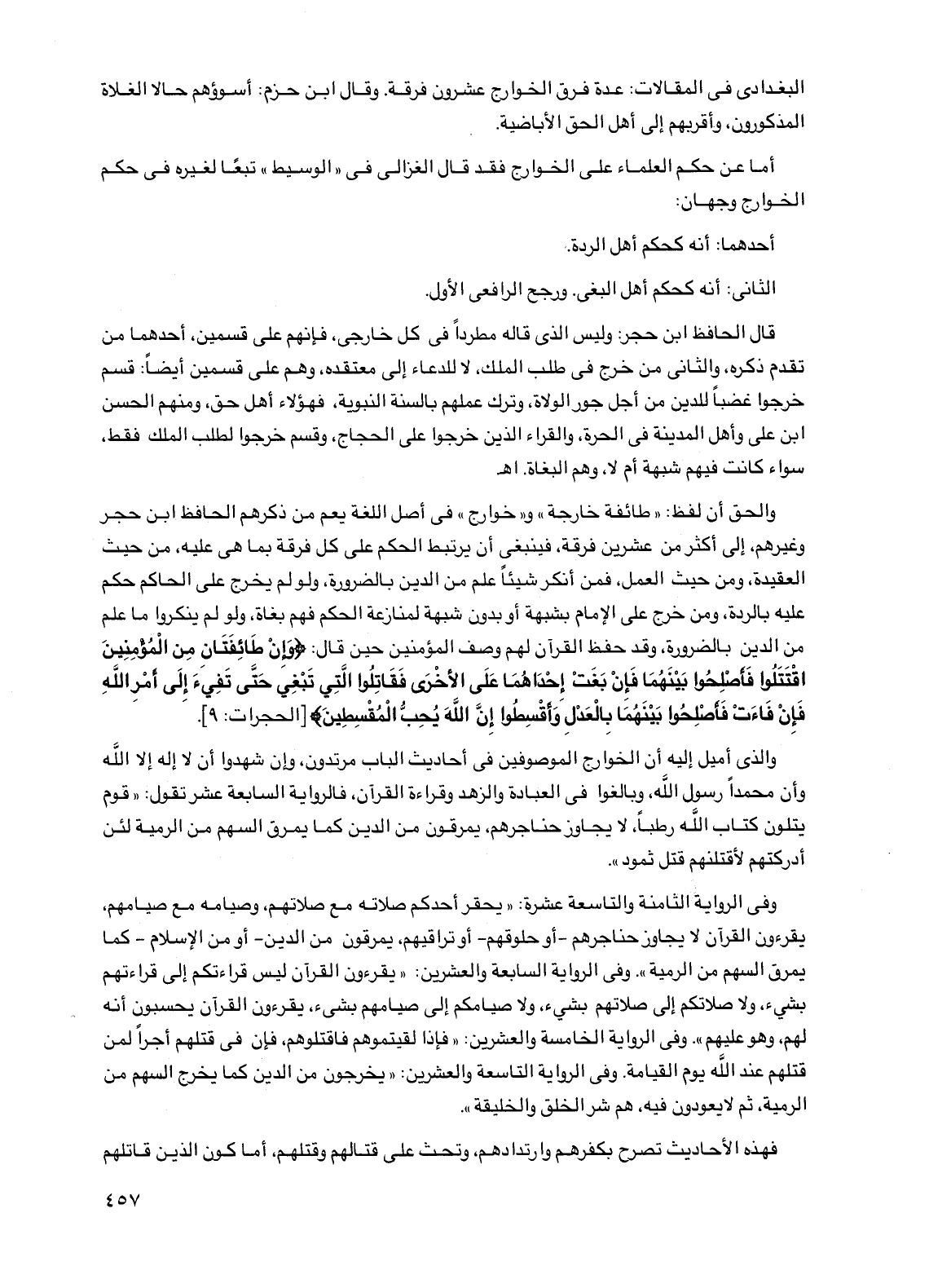 والحق أن لفظ: "طائفة خارجة" و"خوارج" في أصل اللغة يعم من ذكرهم الحافظ ابن حجر وغيرهم، إلى أكثر من عشرين فرقة، فينبغي أن يرتبط الحكم على كل فرقة بما هي عليه، من حيث العقيدة، ومن حيث العمل، فمن أنكر شيئاً علم من الدين بالضرورة، ولو لم يخرج على الحاكم حكم عليه بالردة، ومن خرج على الإمام بشبهة أو بدون شبهة لمنازعة الحكم فهم بغاة، ولو لم ينكروا ما علم من الدين بالضرورة، وقد حفظ القرآن لهم وصف المؤمنين حين قال: {وإن طائفتان من المؤمنين اقتتلوا فأصلحوا بينهما فإن بغت إحداهما على الأخرى فقاتلوا التي تبغي حتى تفيء إلى أمر الله فإن فاءت فأصلحوا بينهما بالعدل وأقسطوا إن الله يحب المقسطين} [الحجرات: 9].