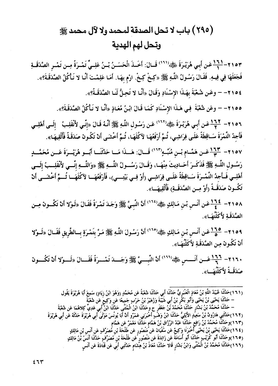 2158 - عن أنس بن مالك رضي الله عنه أن النبي صلى الله عليه وسلم وجد تمرة فقال "لولا أن تكون من الصدقة لأكلتها".