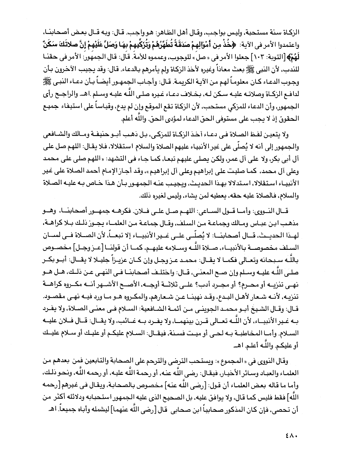 ولا يتعين لفظ الصلاة في دعاء آخذ الزكاة للمزكي، بل ذهب أبو حنيفة ومالك والشافعي والجمهور إلى أنه لا يصلى على غير الأنبياء عليهم الصلاة والسلام استقلالاً، فلا يقال: اللهم صل على آل أبي بكر، ولا على آل عمر، ولكن يصلي عليهم تبعاً، كما جاء في التشهد: "اللهم صلي على محمد وعلى آل محمد، كما صليت على إبراهيم وعلى آل إبراهيم"، وقد أجاز الإمام أحمد الصلاة على غير الأنبياء استقلالاً، استدلالاً بهذا الحديث، ويجيب عنه الجمهور بأن هذا خاص به عليه الصلاة والسلام، فالصلاة عليه حقه، يعطيه لمن يشاء، وليس لغيره ذلك.