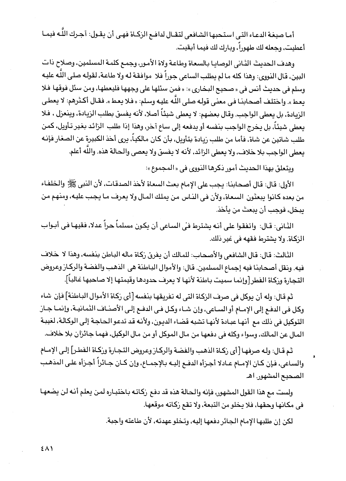 الثالث: قال: قال الشافعي والأصحاب: للمالك أن يفرق زكاة ماله الباطن بنفسه، وهذا لا خلاف فيه. ونقل أصحابنا فيه إجماع المسلمين. قال: والأموال الباطنة هي الذهب والفضة والركاز وعروض التجارة وزكاة الفطر [وإنما سميت باطنة لأنها لا يعرف حدودها وقيمتها إلا صاحبها غالباً].
