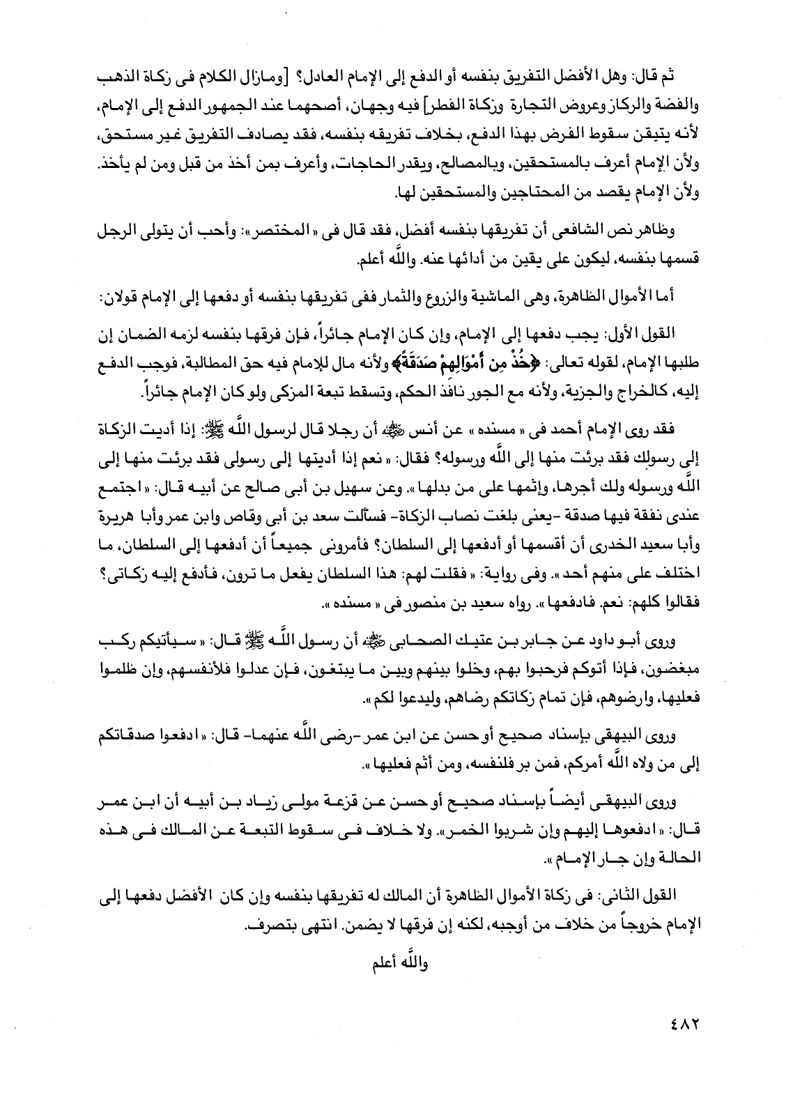 ثم قال: وهل الأفضل التفريق بنفسه أو الدفع إلى الإمام العادل؟ [ومازال الكلام في زكاة الذهب والفضة والركاز وعروض التجارة وزكاة الفطر] فيه وجهان، أصحهما عند الجمهور الدفع إلى الإمام، لأنه يتيقن سقوط الفرض بهذا الدفع، بخلاف تفريقه بنفسه، فقد يصادف التفريق غير مستحق، ولأن الإمام أعرف بالمستحقين، وبالمصالح، ويقدر الحاجات، وأعرف بمن أخذ من قبل ومن لم يأخذ. ولأن الإمام يقصد من المحتاجين والمستحقين لها.