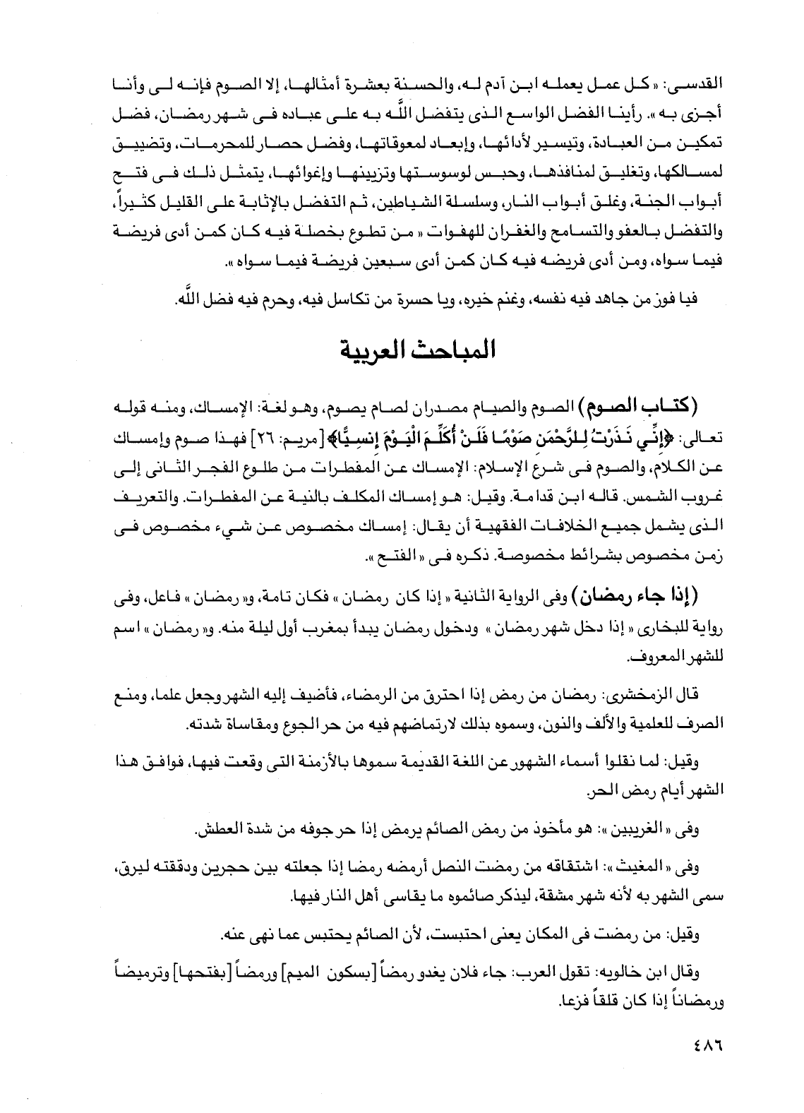 (كتاب الصوم) الصوم والصيام مصدران لصام يصوم، وهو لغة: الإمساك، ومنه قوله تعالى: {إني نذرت للرحمن صوماً فلن أكلم اليوم إنسياً} [مريم: 26] فهذا صوم وإمساك عن الكلام، والصوم في شرع الإسلام: الإمساك عن المفطرات من طلوع الفجر الثاني إلى غروب الشمس. قاله ابن قدامة. وقيل: هو إمساك المكلف بالنية عن المفطرات. والتعريف الذي يشمل جميع الخلافات الفقهية أن يقال: إمساك مخصوص عن شيء مخصوص في زمن مخصوص بشرائط مخصوصة. ذكره في "الفتح".
