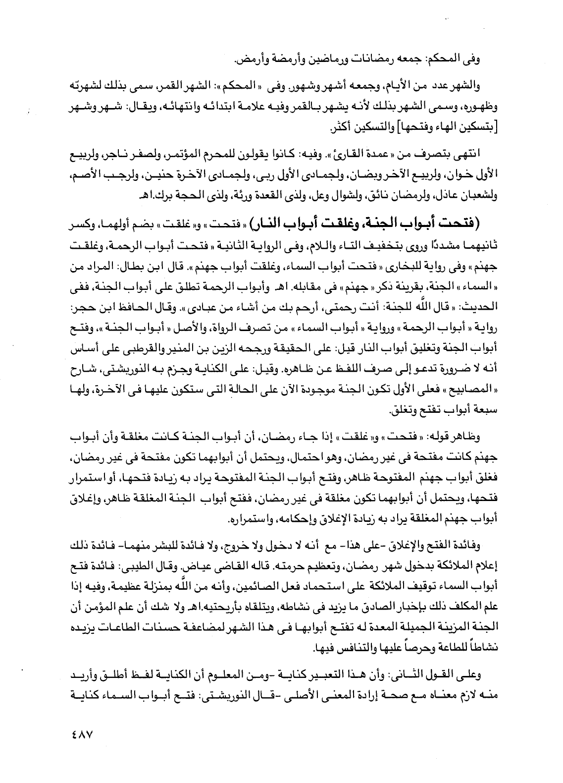 (فتحت أبواب الجنة، وغلقت أبواب النار) "فتحت" و"غلقت" بضم أولهما، وكسر ثانيهما مشدداً وروي بتخفيف التاء واللام، وفي الرواية الثانية "فتحت أبواب الرحمة، وغلقت جهنم" وفي رواية للبخاري "فتحت أبواب السماء، وغلقت أبواب جهنم". قال ابن بطال: المراد من "السماء" الجنة، بقرينة ذكر "جهنم" في مقابله. اهـ وأبواب الرحمة تطلق على أبواب الجنة، ففي الحديث: "قال الله للجنة: أنت رحمتي، أرحم بك من أشاء من عبادي". وقال الحافظ ابن حجر: رواية "أبواب الرحمة" ورواية "أبواب السماء" من تصرف الرواة، والأصل "أبواب الجنة"، وفتح أبواب الجنة وتغليق أبواب النار قيل: على الحقيقة ورجحه الزين بن المنير والقرطبي على أساس أنه لا ضرورة تدعو إلى صرف اللفظ عن ظاهره. وقيل: على الكناية وجزم به النوربشتي، شارح "المصابيح" فعلى الأول تكون الجنة موجودة الآن على الحالة التي ستكون عليها في الآخرة، ولها سبعة أبواب تفتح وتغلق.
