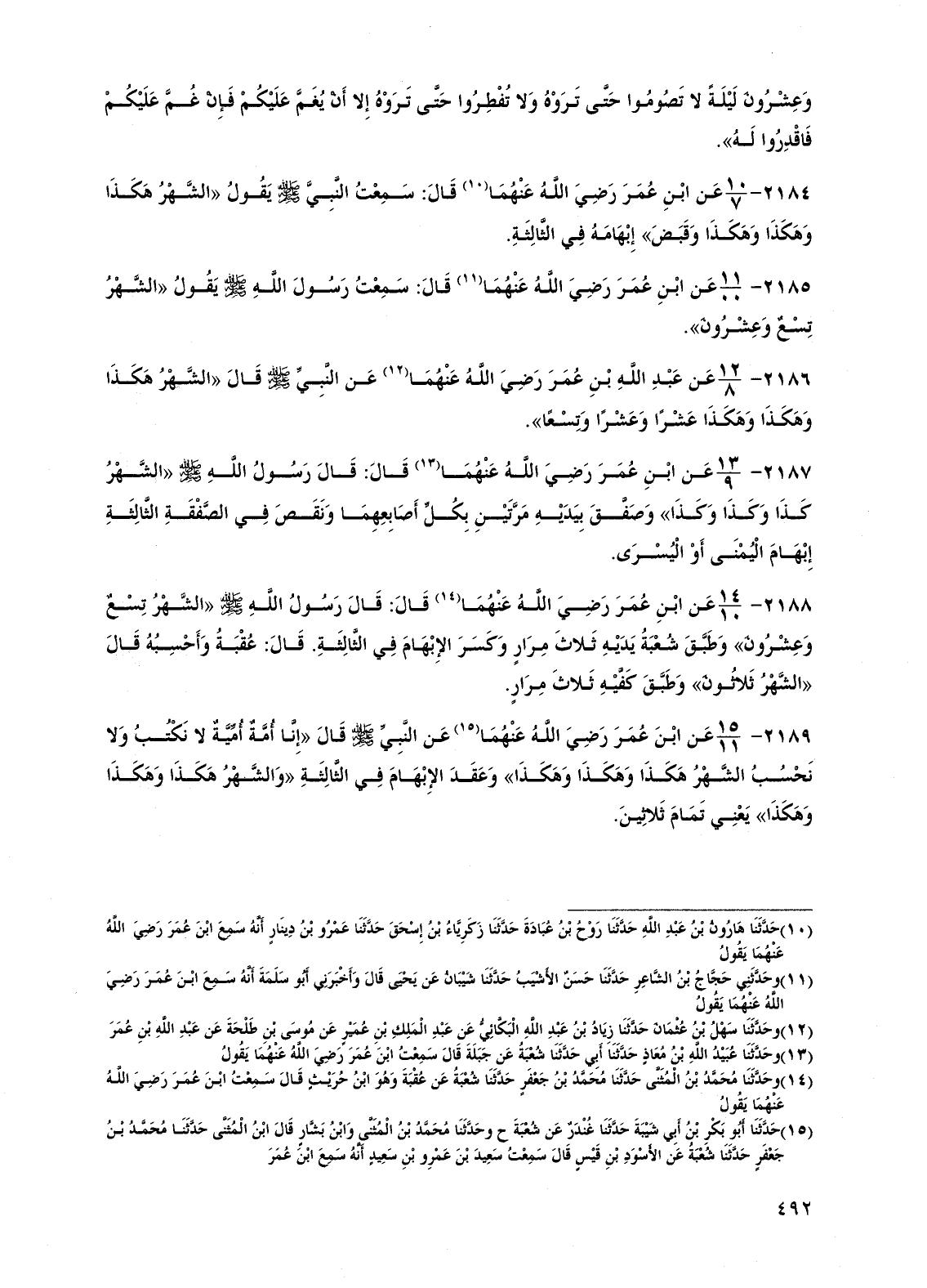 2189 - عن ابن عمر رضي الله عنهما عن النبي صلى الله عليه وسلم قال "إنا أمة أمية لا نكتب ولا نحسب الشهر هكذا وهكذا وهكذا" وعقد الإبهام في الثالثة "والشهر هكذ وهكذا وهكذا" يعني تمام ثلاثين.