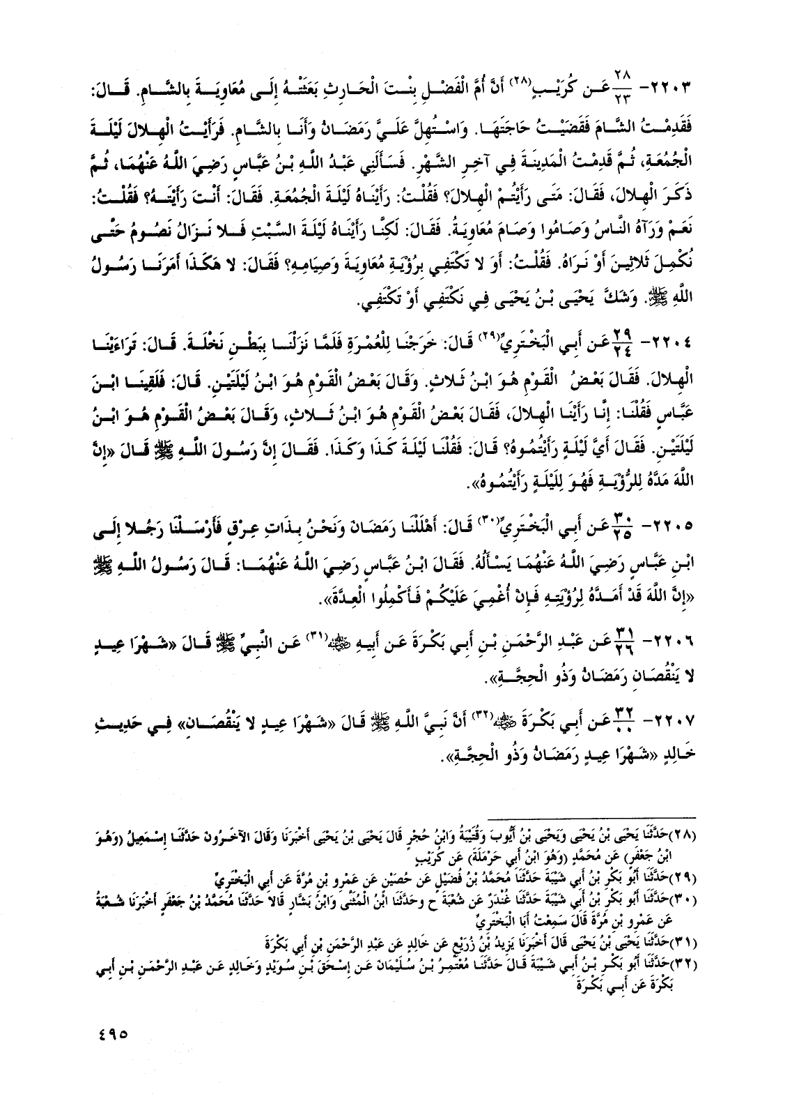 2204 - عن أبي البختري قال: خرجنا للعمرة فلما نزلنا ببطن نخلة. قال: تراءينا الهلال. فقال بعض القوم هو ابن ثلاث. وقال بعض القوم هو ابن ليلتين. قال: فلقينا ابن عباس فقلنا: إنا رأينا الهلال، فقال بعض القوم هو ابن ثلاث، وقال بعض القوم هو ابن ليلتين. فقال أي ليلة رأيتموه؟ قال: فقلنا ليلة كذا وكذا. فقال إن رسول الله صلى الله عليه وسلم قال "إن الله مده للرؤية فهو لليلة رأيتموه".