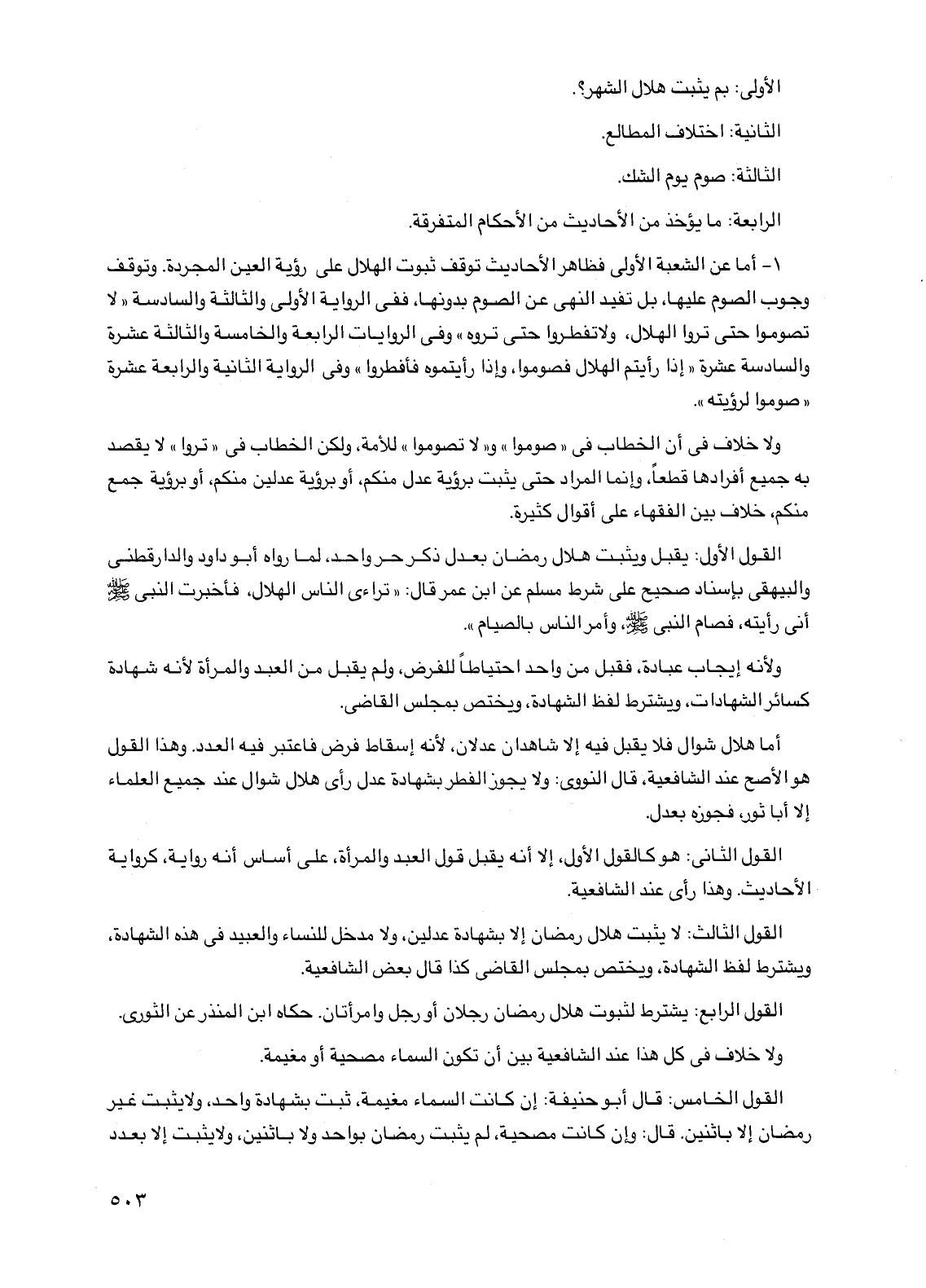 1 - أما عن الشعبة الأولى فظاهر الأحاديث توقف ثبوت الهلال على رؤية العين المجردة. وتوقف وجوب الصوم عليها، بل تفيد النهي عن الصوم بدونها، ففي الرواية الأولى والثالثة والسادسة "لا تصوموا حتى تروا الهلال، ولا تفطروا حتى تروه" وفي الروايات الرابعة والخامسة والثالثة عشرة والسادسة عشرة "إذا رأيتم الهلال فصوموا، وإذا رأيتموه فأفطروا" وفي الرواية الثانية والرابعة عشرة "صوموا لرؤيته".
