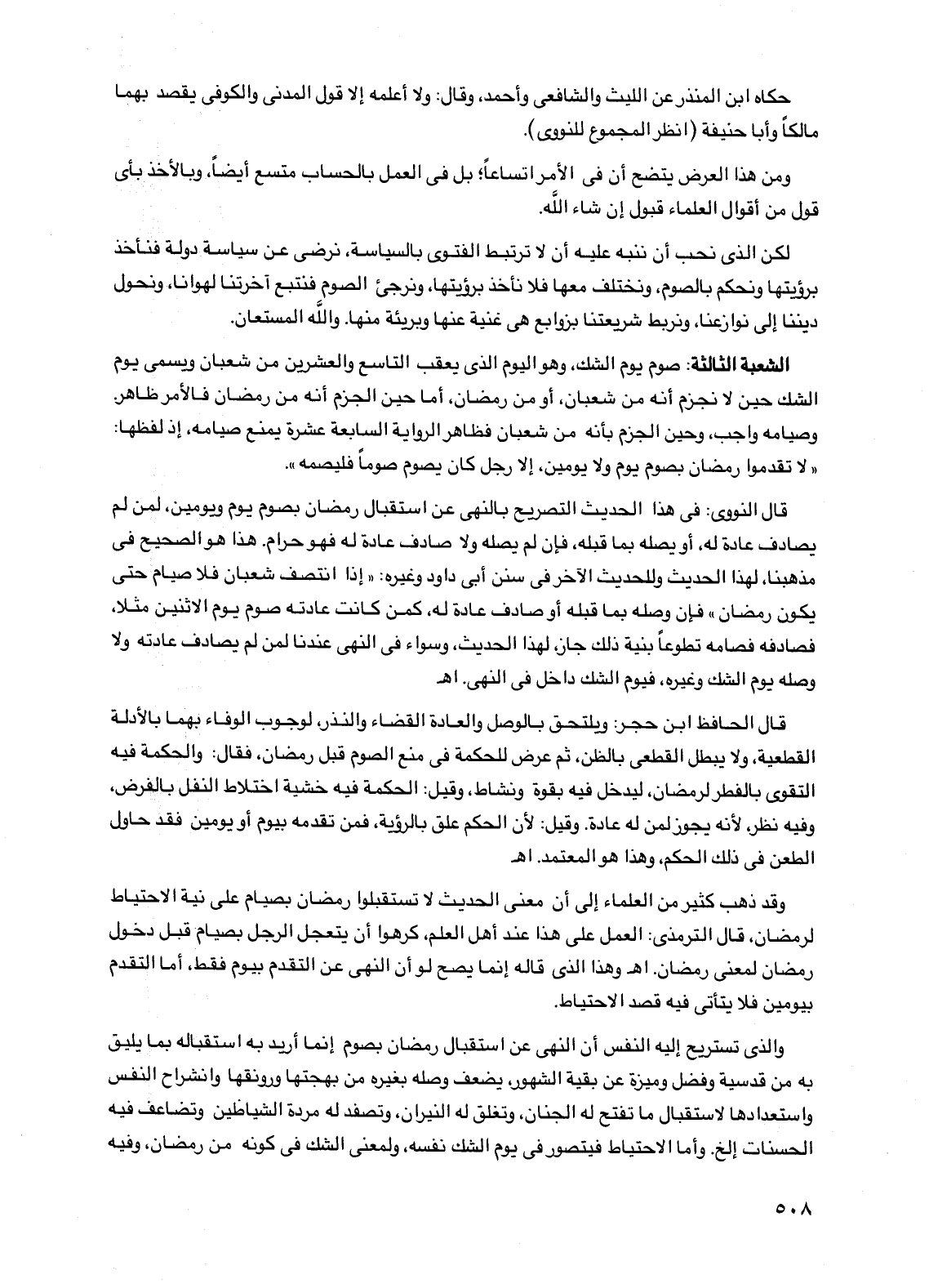 الشعبة الثالثة: صوم يوم الشك، وهو اليوم الذي يعقب التاسع والعشرين من شعبان ويسمى يوم الشك حين لا نجزم أنه من شعبان، أو من رمضان، أما حين الجزم أنه من رمضان فالأمر ظاهر. وصيامه واجب، وحين الجزم بأنه من شعبان فظاهر الرواية السابعة عشرة يمنع صيامه، إذ لفظها: "لا تقدموا رمضان بصوم يوم ولا يومين، إلا رجل كان يصوم صوماً فليصمه".