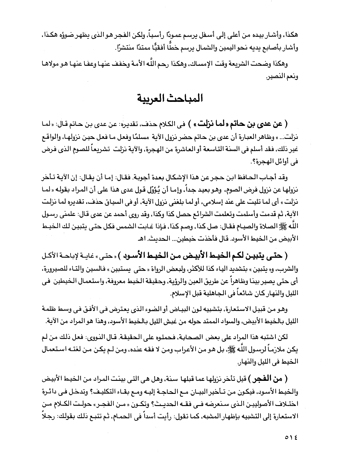 (من الفجر) قيل تأخر نزولها عما قبلها سنة، وهل هي التي بينت المراد من الخيط الأبيض والخيط الأسود، فيكون من تأخير البيان مع الحاجة إليه ومع بقاء التكليف؟ وتدخل في دائرة اختلاف الأصوليين الذي سنعرضه في فقه الحديث؟ وتكون "من الفجر" حولت الكلام من الاستعارة إلى التشبيه بإظهار المشبه، كما تقول: رأيت أسداً في الحمام، ثم تتبع ذلك بقولك: رجلاً