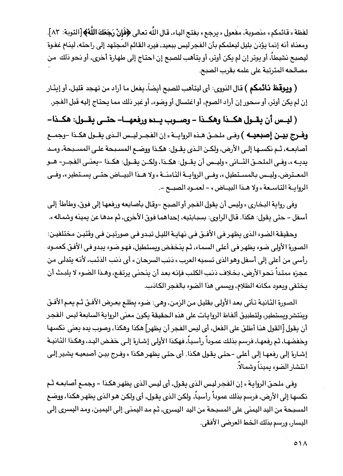 (ليس أن يقول هكذا وهكذا -وصوب يده ورفعها- حتى يقول: هكذا -وفرج بين إصبعيه) وفي ملحق هذه الرواية "إن الفجر ليس الذي يقول هكذا -وجمع أصابعه، ثم نكسها إلى الأرض، ولكن الذي يقول: هكذا ووضع المسبحة على المسبحة، ومد يديه"، وفي الملحق الثاني" وليس أن يقول: هكذا، ولكن يقول: هكذا -يعني الفجر- هو المعترض، وليس بالمستطيل"، وفي الرواية الثامنة "ولا هذا البياض حتى يستطير"، وفي الرواية التاسعة "ولا هذا البياض" -لعمود الصبح-.