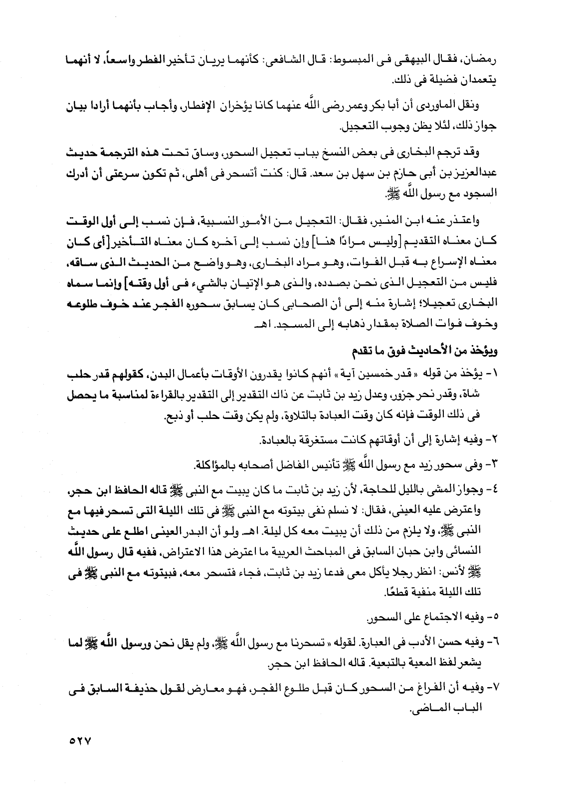 4 - وجواز المشي بالليل للحاجة، لأن زيد بن ثابت ما كان يبيت مع النبي صلى الله عليه وسلم قاله الحافظ ابن حجر، واعترض عليه العيني، فقال: لا نسلم نفي بيتوتته مع النبي صلى الله عليه وسلم في تلك الليلة التي تسحر فيها مع النبي صلى الله عليه وسلم، ولا يلزم من ذلك أن يبيت معه كل ليلة. اهـ ولو أن البدر العيني اطلع على حديث النسائي وابن حبان السابق في المباحث العربية ما اعترض هذا الاعتراض، ففيه قال رسول الله صلى الله عليه وسلم لأنس: انظر رجلاً يأكل معي فدعا زيد بن ثابت، فجاء فتسحر معه، فبيتوتته مع النبي صلى الله عليه وسلم في تلك الليلة منفية قطعاً.