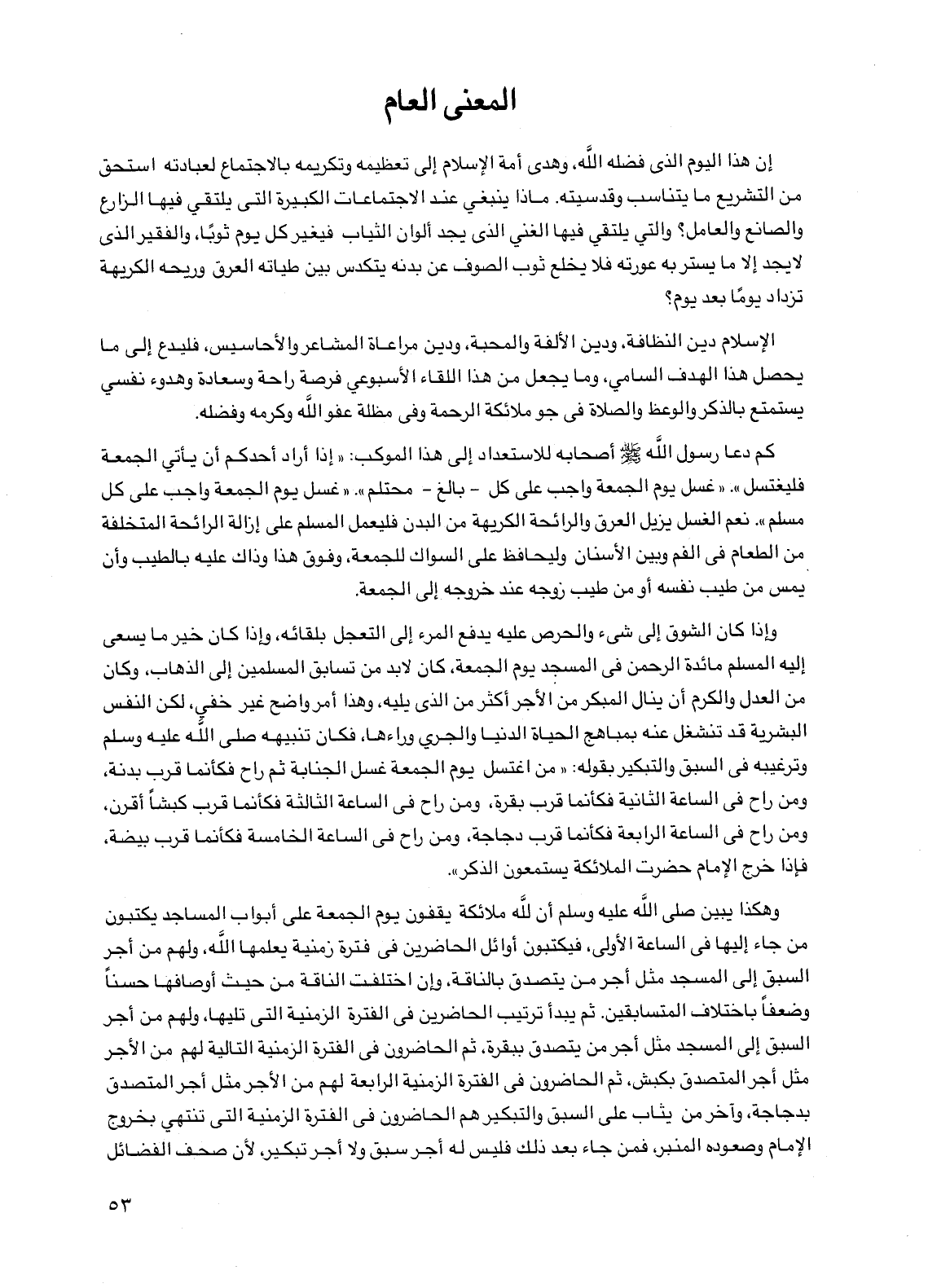 إن هذا اليوم الذي فضله الله، وهدى أمة الإسلام إلى تعظيمه وتكريمه بالاجتماع لعبادته استحق من التشريع ما يتناسب وقدسيته. ماذا ينبغي عند الاجتماعات الكبيرة التي يلتقي فيها الزارع والصانع والعامل؟ والتي يلتقي فيها الغني الذي يجد ألوان الثياب فيغير كل يوم ثوباً، والفقير الذي لا يجد إلا ما يستر به عورته فلا يخلع ثوب الصوف عن بدنه يتكدس بين طياته العرق وريحه الكريهة تزداد يوماً بعد يوم؟