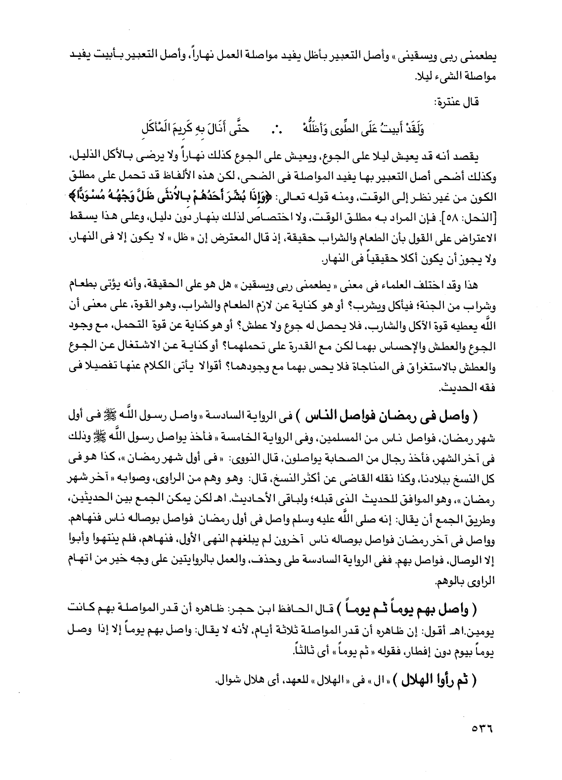 يقصد أنه قد يعيش ليلاً على الجوع، ويعيش على الجوع كذلك نهاراً ولا يرضى بالأكل الذليل، وكذلك أضحى أصل التعبير بها يفيد المواصلة في الضحى، لكن هذه الألفاظ قد تحمل على مطلق الكون من غير نظر إلى الوقت، ومنه قوله تعالى: {وإذا بشر أحدهم بالأنثى ظل وجهه مسوداً} [النحل: 58]. فإن المراد به مطلق الوقت، ولا اختصاص لذلك بنهار دون دليل، وعلى هذا يسقط الاعتراض على القول بأن الطعام والشراب حقيقة، إذ قال المعترض إن "ظل" لا يكون إلا في النهار، ولا يجوز أن يكون أكلاً حقيقياً في النهار.