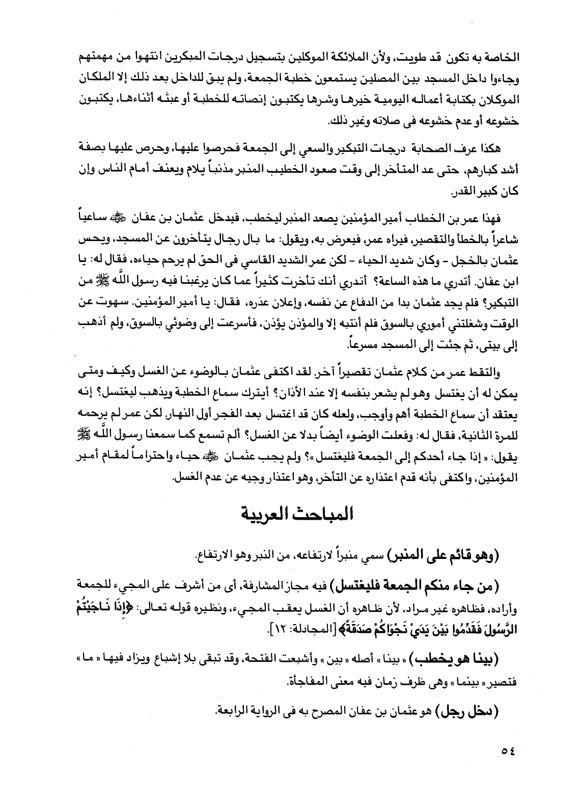 والتقط عمر من كلام عثمان تقصيراً آخر. لقد اكتفى عثمان بالوضوء عن الغسل وكيف ومتى يمكن له أن يغتسل وهو لم يشعر بنفسه إلا عند الأذان؟ أيترك سماع الخطبة ويذهب ليغتسل؟ إنه يعتقد أن سماع الخطبة أهم وأوجب، ولعله كان قد اغتسل بعد الفجر أول النهار. لكن عمر لم يرحمه للمرة الثانية، فقال له: وفعلت الوضوء أيضاً بدلاً عن الغسل؟ ألم تسمع كما سمعنا رسول الله صلى الله عليه وسلم يقول: "إذا جاء أحدكم إلى الجمعة فليغتسل"؟ ولم يجب عثمان رضي الله عنه حياء واحتراماً لمقام أمير المؤمنين، واكتفى بأنه قدم اعتذاره عن التأخر، وهو اعتذار وجيه عن عدم الغسل.
