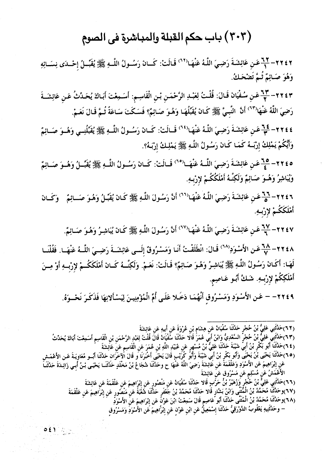 2243 - عن سفيان قال: قلت لعبد الرحمن بن القاسم: أسمعت أباك يحدث عن عائشة رضي الله عنها أن النبي صلى الله عليه وسلم كان يقبلها وهو صائم؟ فسكت ساعة ثم قال نعم.