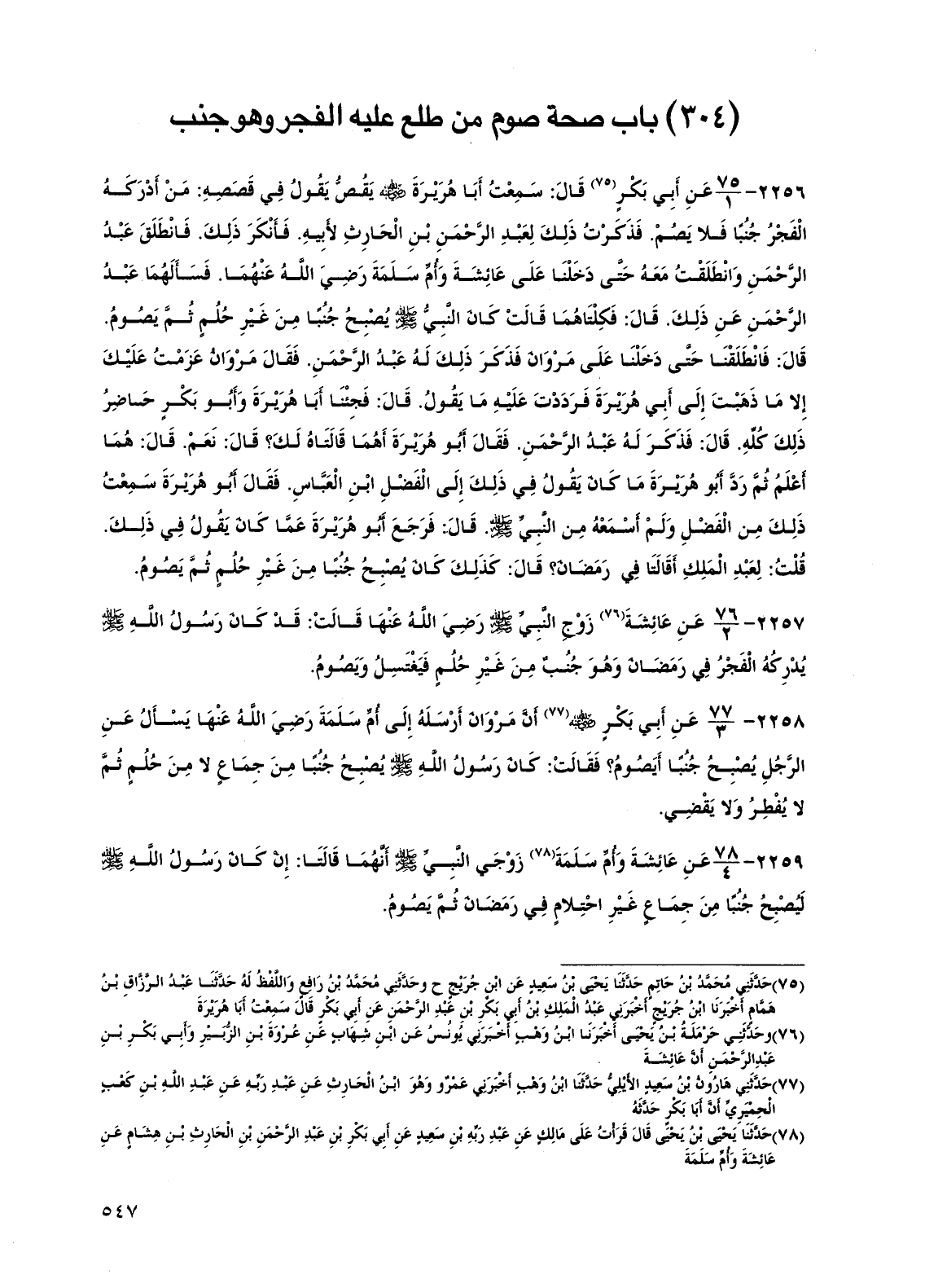 2256 - عن أبي بكر قال: سمعت أبا هريرة رضي الله عنه يقص يقول في قصصه: من أدركه الفجر جنباً فلا يصم. فذكرت ذلك لعبد الرحمن بن الحارث لأبيه. فأنكر ذلك. فانطلق عبد الرحمن وانطلقت معه حتى دخلنا على عائشة وأم سلمة رضي الله عنهما. فسألهما عبد الرحمن عن ذلك. قال: فكلتاهما قالت كان النبي صلى الله عليه وسلم يصبح جنباً من غير حلم ثم يصوم. قال: فانطلقنا حتى دخلنا على مروان فذكر ذلك له عبد الرحمن. فقال مروان عزمت عليك إلا ما ذهبت إلى أبي هريرة فرددت عليه ما يقول. قال: فجئنا أبا هريرة وأبو بكر حاضر ذلك كله. قال: فذكر له عبد الرحمن. فقال أبو هريرة أهما قالتاه لك؟ قال: نعم. قال: هما أعلم ثم رد أبو هريرة ما كان يقول في ذلك إلى الفضل بن العباس. فقال أبو هريرة سمعت ذلك من الفضل ولم أسمعه من النبي صلى الله عليه وسلم. قال: فرجع أبو هريرة عما كان يقول في ذلك. قلت: لعبد الملك أقالتا في رمضان؟ قال: كذلك كان يصبح جنباً من غير حلم ثم يصوم.