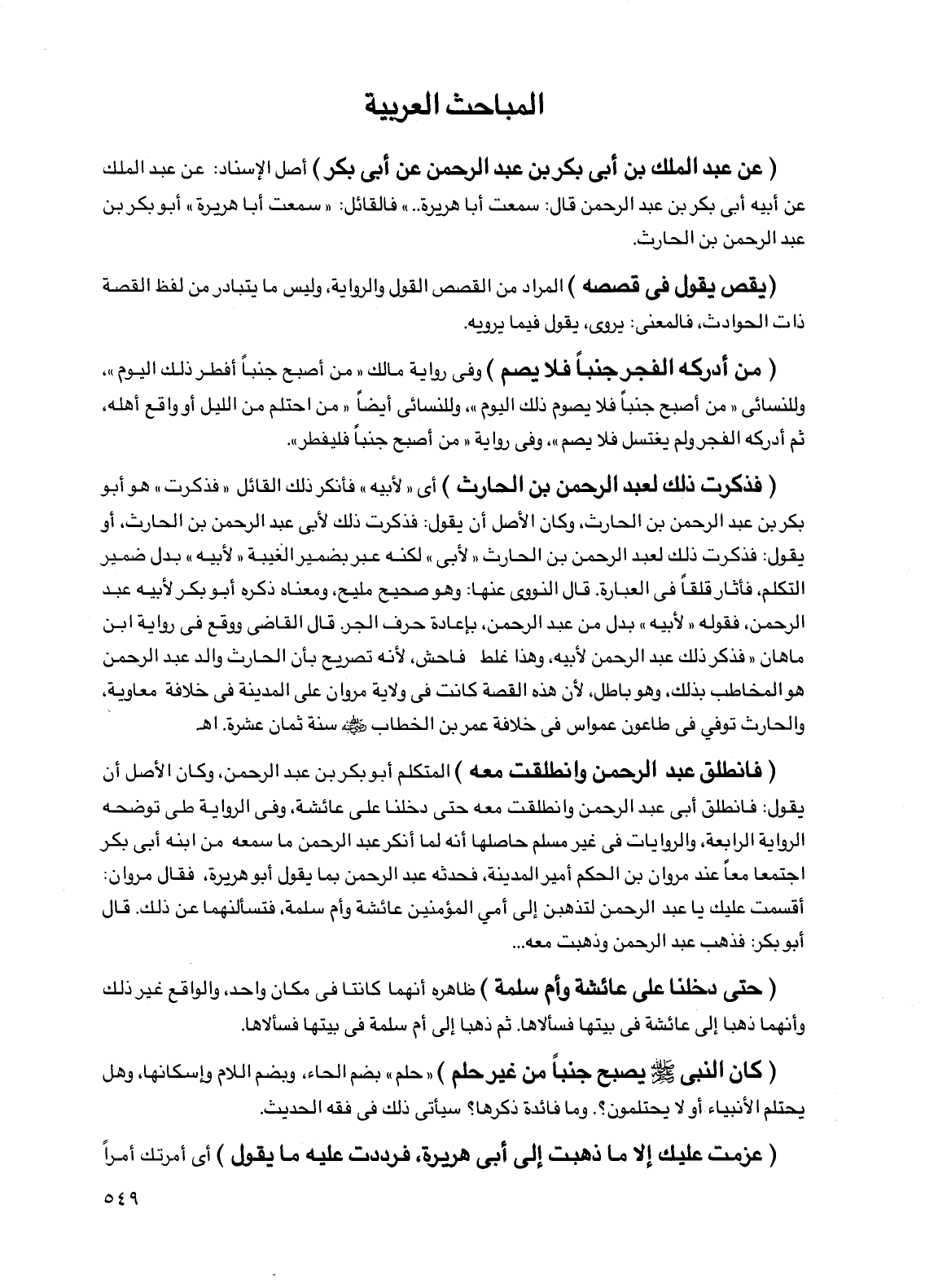 (فذكرت ذلك لعبد الرحمن بن الحارث) أي "لأبيه" فأنكر ذلك القائل "فذكرت" هو أبو بكر بن عبد الرحمن بن الحارث، وكان الأصل أن يقول: فذكرت ذلك لأبي عبد الرحمن بن الحارث، أو يقول: فذكرت ذلك لعبد الرحمن بن الحارث "لأبي" لكنه عبر بضمير الغيبة "لأبيه" بدل ضمير التكلم، فأثار قلقاً في العبارة. قال النووي عنها: وهو صحيح مليح، ومعناه ذكره أبو بكر لأبيه عبد الرحمن، فقوله "لأبيه" بدل من عبد الرحمن، بإعادة حرف الجر. قال القاضي ووقع في رواية ابن ماهان "فذكر ذلك عبد الرحمن لأبيه، وهذا غلط فاحش، لأنه تصريح بأن الحارث والد عبد الرحمن هو المخاطب بذلك، وهو باطل، لأن هذه القصة كانت في ولاية مروان على المدينة في خلافة معاوية، والحارث توفي في طاعون عمواس في خلافة عمر بن الخطاب رضي الله عنه سنة ثمان عشرة. اهـ.
