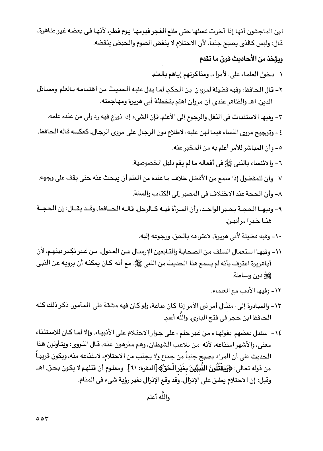 2 - قال الحافظ: وفيه فضيلة لمروان بن الحكم، لما يدل عليه الحديث من اهتمامه بالعلم ومسائل الدين. اهـ والظاهر عندي أن مروان اهتم بتخطئة أبي هريرة ومهاجمته.