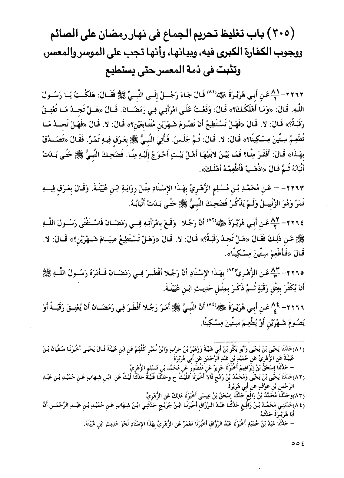 (305) باب تغليظ تحريم الجماع في نهار رمضان على الصائم ووجوب الكفارة الكبرى فيه، وبيانها، وأنها تجب على الموسر والمعسر، وتثبت في ذمة المعسر حتى يستطيع