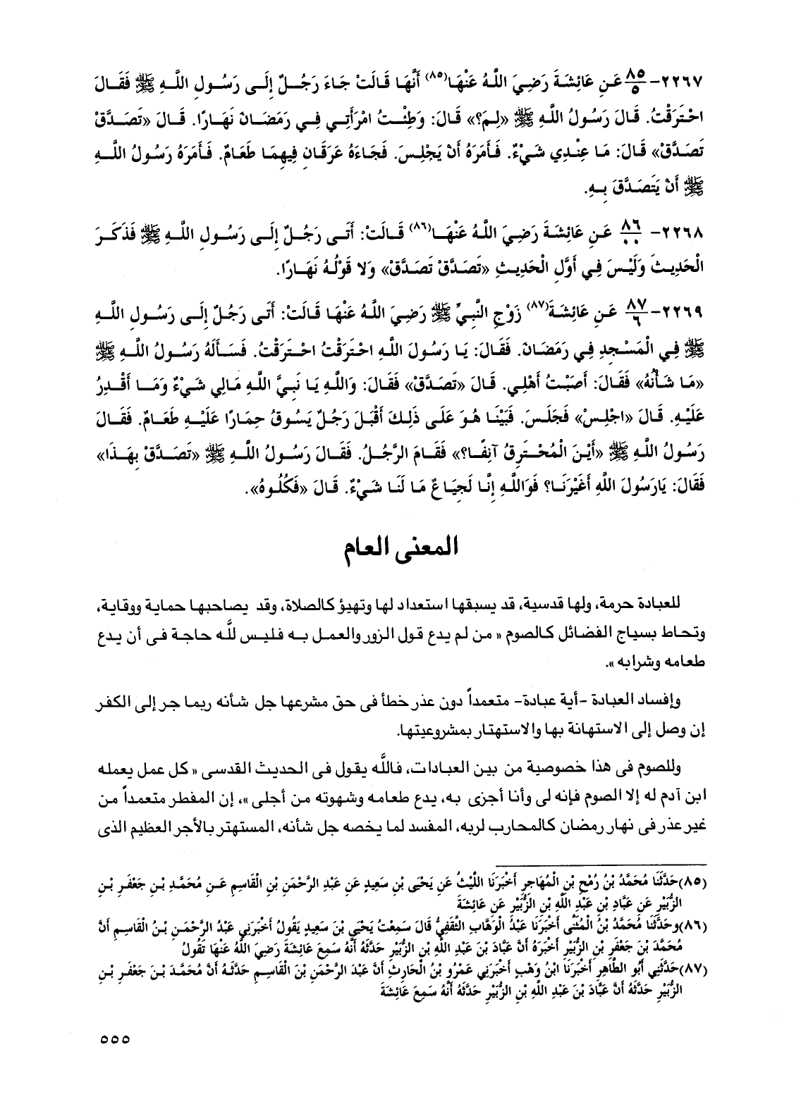 2269 - عن عائشة زوج النبي صلى الله عليه وسلم رضي الله عنها قالت: أتى رجل إلى رسول الله صلى الله عليه وسلم في المسجد في رمضان. فقال: يا رسول الله احترقت احترقت. فسأله رسول الله صلى الله عليه وسلم "ما شأنه" فقال: أصبت أهلي. قال "تصدق" فقال: والله يا نبي الله ما لي شيء وما أقدر عليه. قال "اجلس" فجلس. فبينا هو على ذلك أقبل رجل يسوق حماراً عليه طعام. فقال رسول الله صلى الله عليه وسلم "أين المحترق آنفاً؟ " فقام الرجل. فقال رسول الله صلى الله عليه وسلم "تصدق بهذا" فقال: يا رسول الله أغيرنا؟ فوالله إنا لجياع ما لنا شيء. قال "فكلوه".