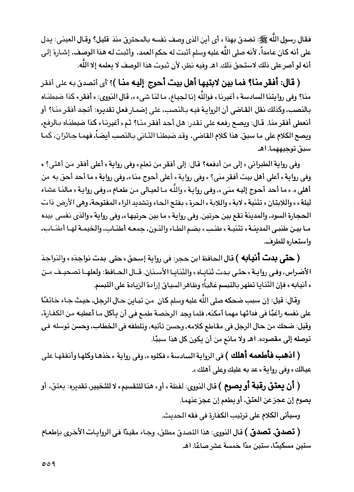 (قال: أفقر منا؟ فما بين لابتيها أهل بيت أحوج إليه منا)؟ أي أتصدق به على أفقر منا؟ وفي روايتنا السادسة "أغيرنا" فوالله إنا لجياع، ما لنا شيء"، قال النووي: "أفقر" كذا ضبطناه بالنصب، وكذلك نقل القاضي أن الرواية فيه بالنصب، على إضمار فعل تقديره، أتجد أفقر منا؟ أو أنعطي أفقر منا. قال: ويصح رفعه على تقدر: هل أحد أفقر منا؟ ثم "أغيرنا" كذا ضبطناه بالرفع، ويصح الكلام على ما سبق. هذا كلام القاضي، وقد ضبطنا الثاني بالنصب أيضاً، فهما جائزان، كما سبق توجيههما. اهـ.