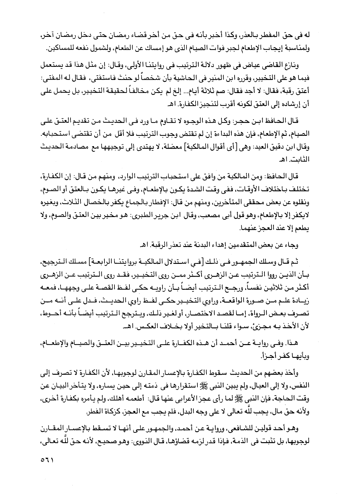 قال الحافظ: ومن المالكية من وافق على استحباب الترتيب الوارد، ومنهم من قال: إن الكفارة، تختلف باختلاف الأوقات، ففي وقت الشدة يكون بالإطعام، وفي غيرها يكون بالعتق أو الصوم، ونقلوه عن بعض محققي المتأخرين، ومنهم من قال: الإفطار بالجماع يكفر بالخصال الثلاث، وبغيره لا يكفر إلا بالإطعام، وهو قول أبي مصعب، وقال ابن جرير الطبري: هو مخير بين العتق والصوم، ولا يطعم إلا عند العجز عنهما.