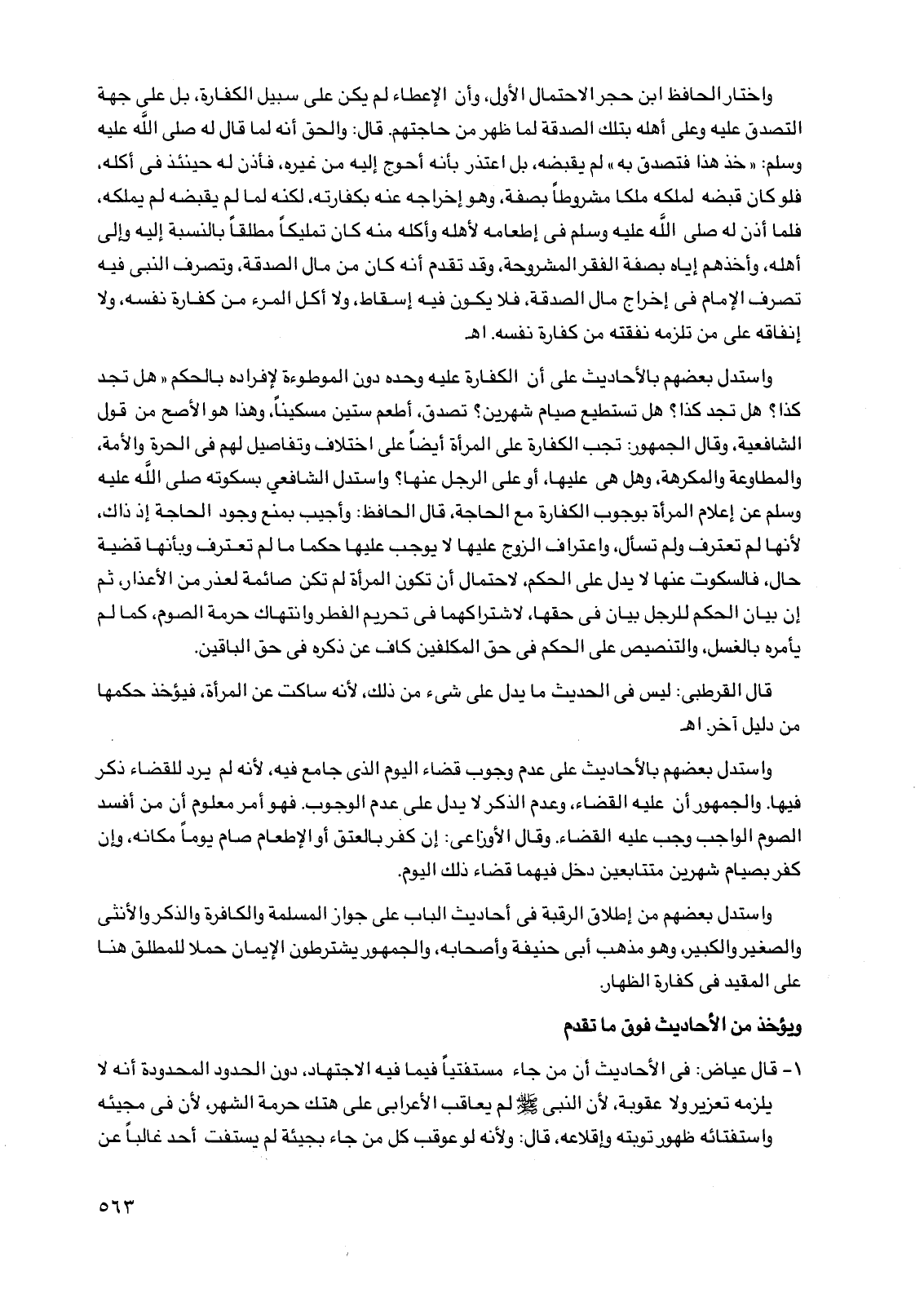 واختار الحافظ ابن حجر الاحتمال الأول، وأن الإعطاء لم يكن على سبيل الكفارة، بل على جهة التصدق عليه وعلى أهله بتلك الصدقة لما ظهر من حاجتهم. قال: والحق أنه لما قال له صلى الله عليه وسلم: "خذ هذا فتصدق به" لم يقبضه، بل اعتذر بأنه أحوج إليه من غيره، فأذن له حينئذ في أكله، فلو كان قبضه لملكه ملكاً مشروطاً بصفة، وهو إخراجه عنه بكفارته، لكنه لما لم يقبضه لم يملكه، فلما أذن له صلى الله عليه وسلم في إطعامه لأهله وأكله منه كان تمليكاً مطلقاً بالنسبة إليه وإلى أهله، وأخذهم إياه بصفة الفقر المشروحة، وقد تقدم أنه كان من مال الصدقة، وتصرف النبي فيه تصرف الإمام في إخراج مال الصدقة، فلا يكون فيه إسقاط، ولا أكل المرء من كفارة نفسه، ولا إنفاقه على من تلزمه نفقته من كفارة نفسه. اهـ.