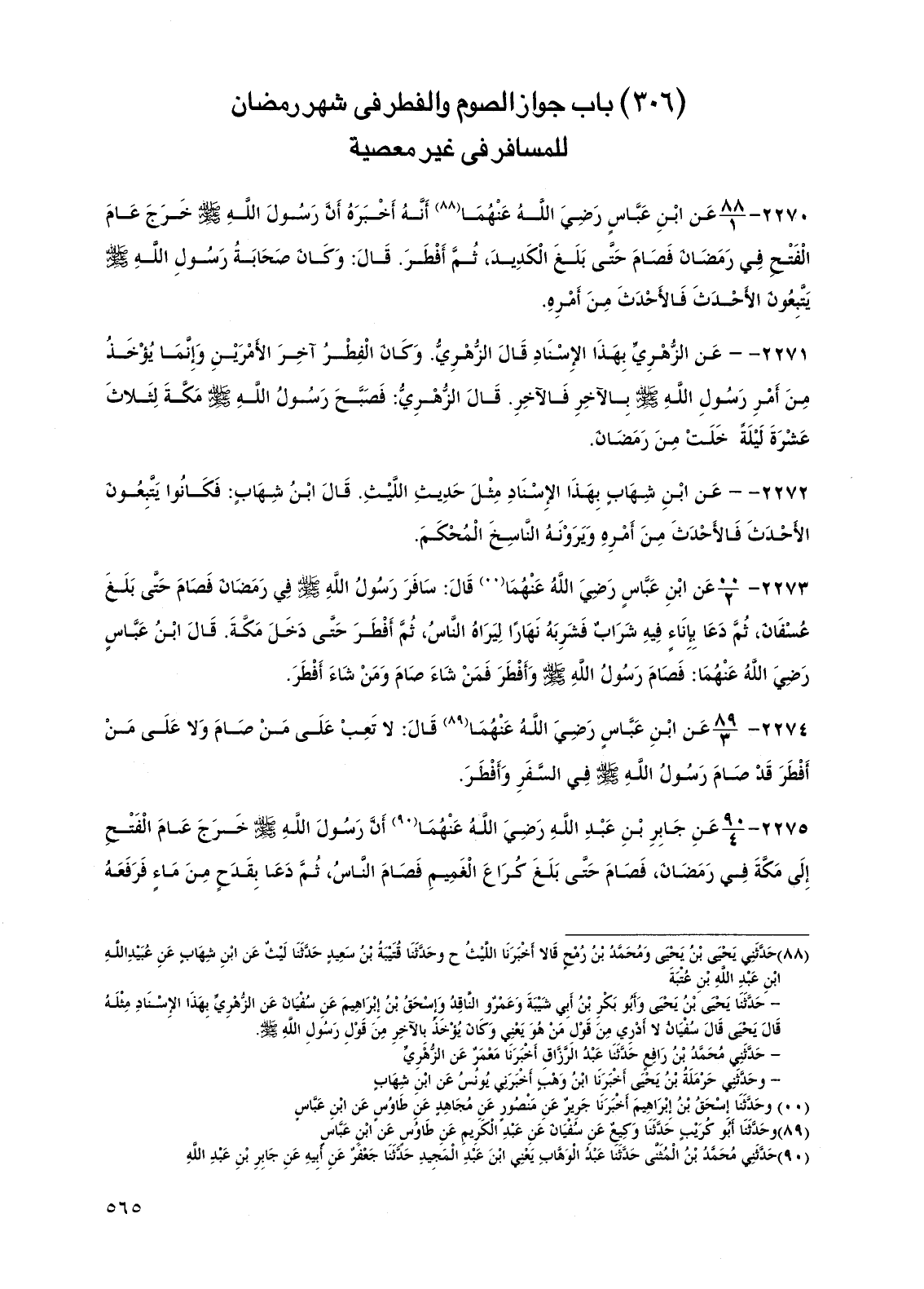 2270 - عن ابن عباس رضي الله عنهما أنه أخبره أن رسول الله صلى الله عليه وسلم خرج عام الفتح في رمضان فصام حتى بلغ الكديد، ثم أفطر. قال: وكان صحابة رسول الله صلى الله عليه وسلم يتبعون الأحدث فالأحدث من أمره.