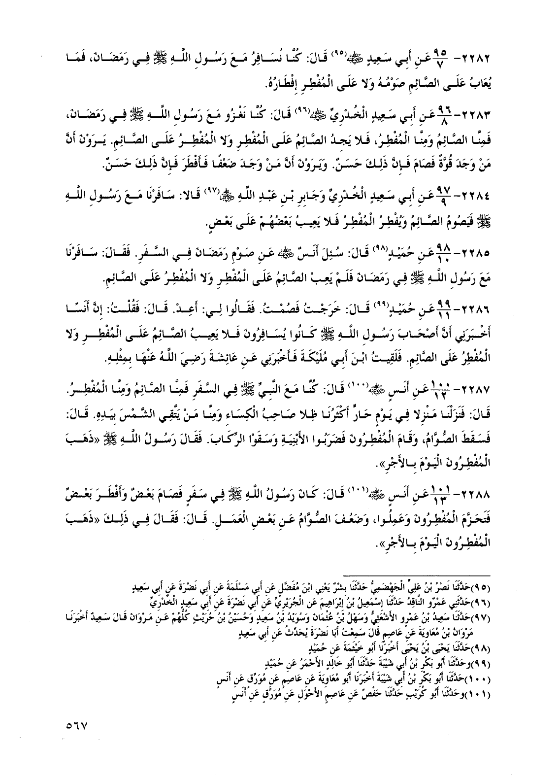 2285 - عن حميد قال: سئل أنس رضي الله عنه عن صوم رمضان في السفر. فقال: سافرنا مع رسول الله صلى الله عليه وسلم في رمضان فلم يعب الصائم على المفطر ولا المفطر على الصائم.