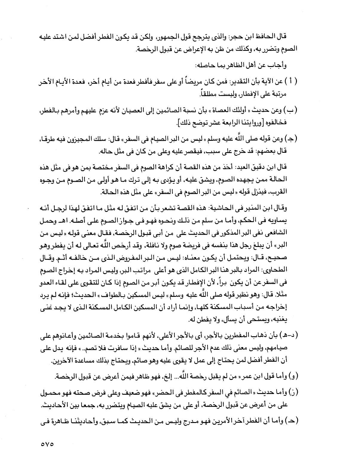 (جـ) وعن قوله صلى الله عليه وسلم "ليس من البر الصيام في السفر" قال: سلك المجيزون فيه طرقاً، قال بعضهم: قد خرج على سبب، فيقصر عليه وعلى من كان في مثل حاله.