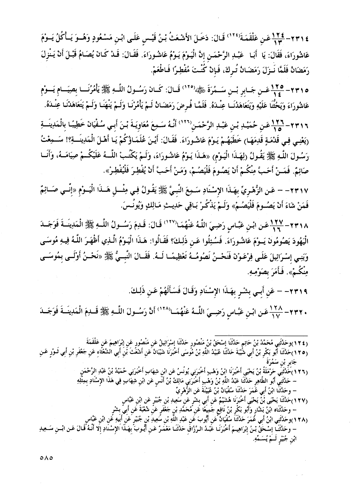 2314 - عن علقمة قال: دخل الأشعث بن قيس على ابن مسعود وهو يأكل يوم عاشوراء، فقال: يا أبا عبد الرحمن إن اليوم يوم عاشوراء. فقال: قد كان يصام قبل أن ينزل رمضان فلما نزل رمضان ترك، فإن كنت مفطراً فاطعم.